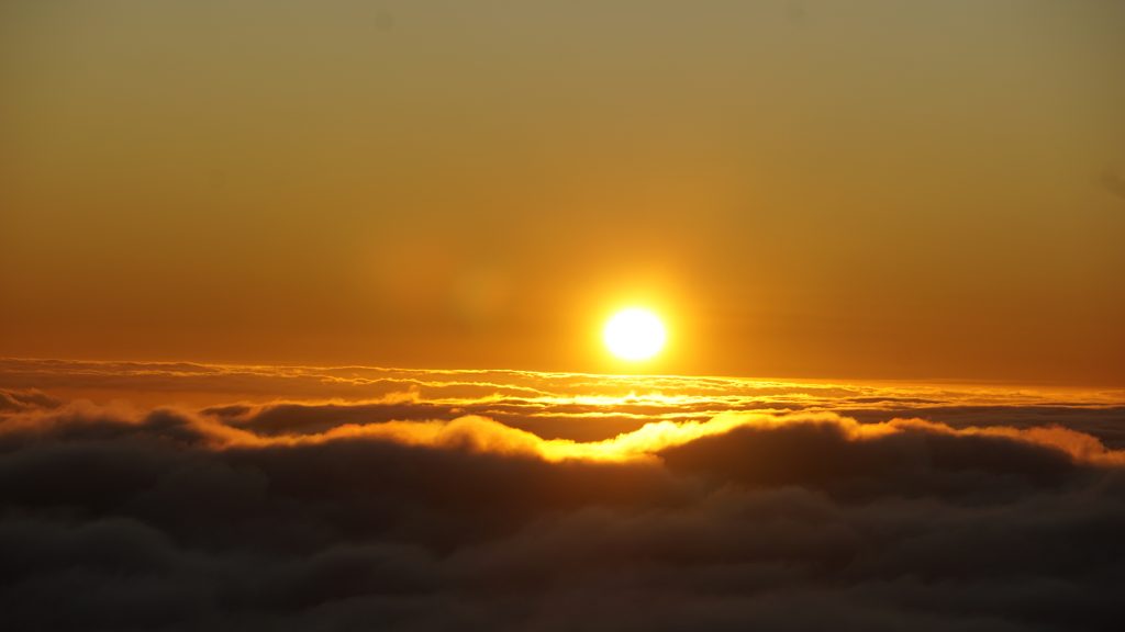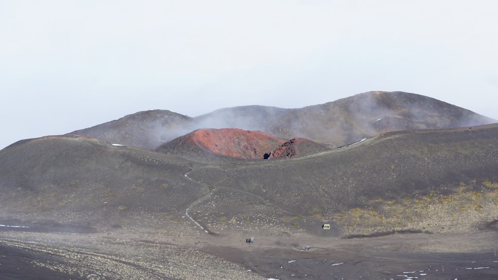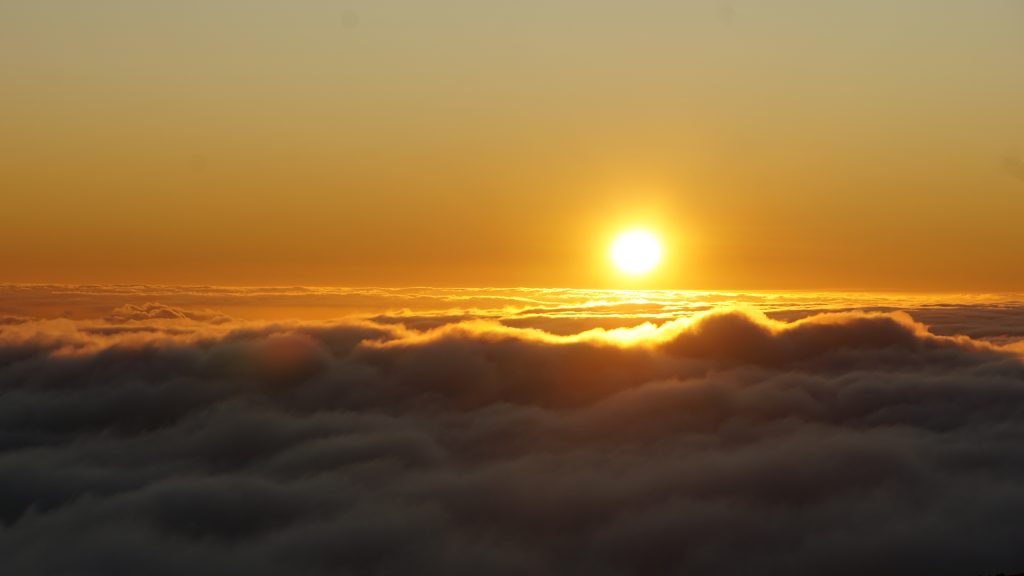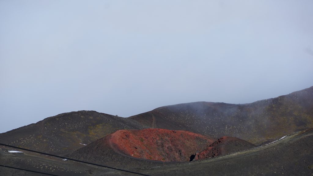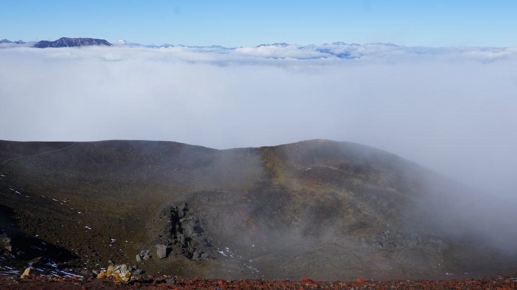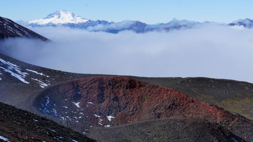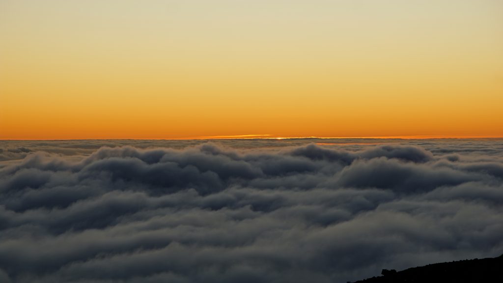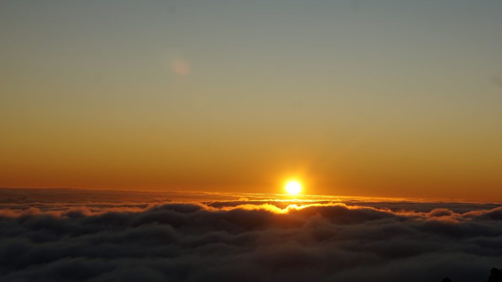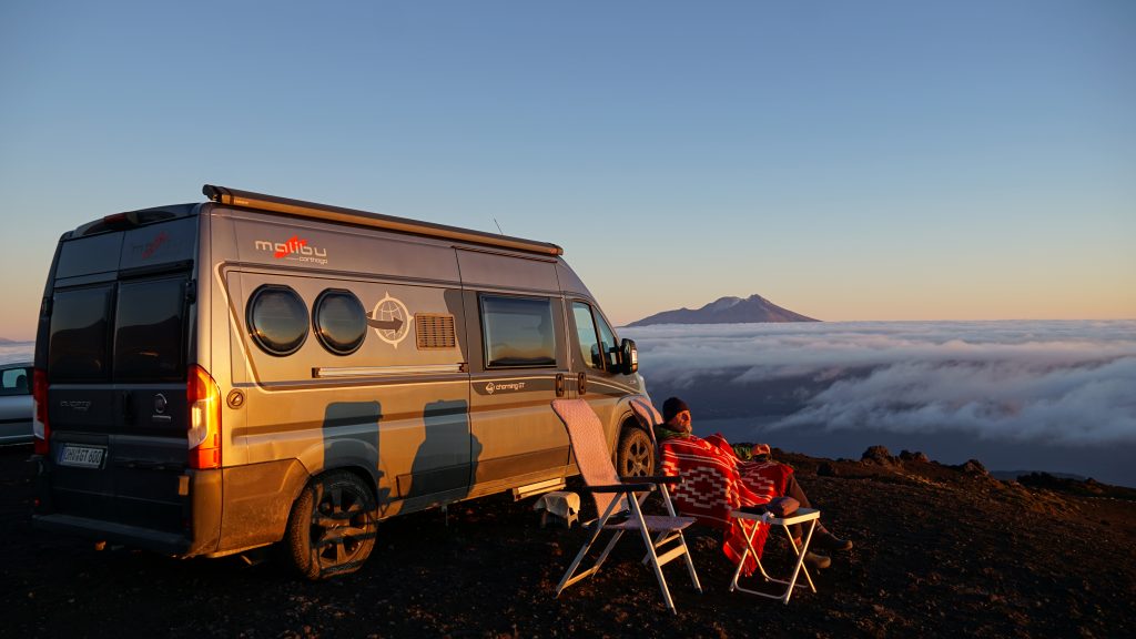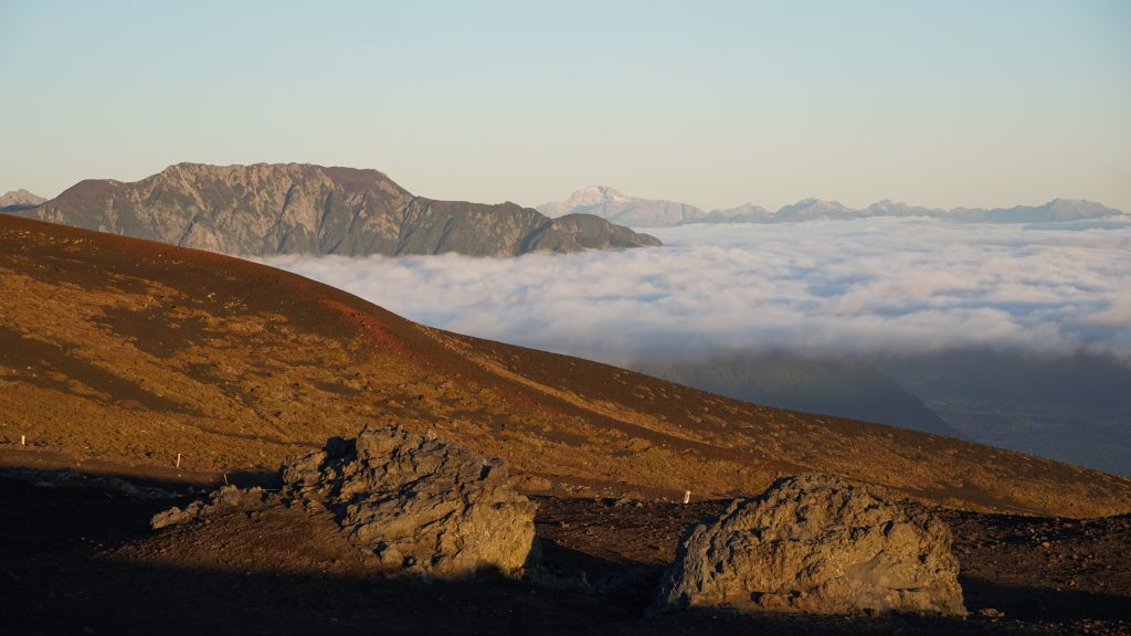 Mit dem Auto bis auf 1200 m Höhe fahren, zum roten Krater in der Vulkanasche wandern und die Nacht hier oben verbringen. Wir stehen über den Wolken und beobachten den Sonnenuntergang, wie cool ist das denn! (Ein bisschen wie im Flugzeug)