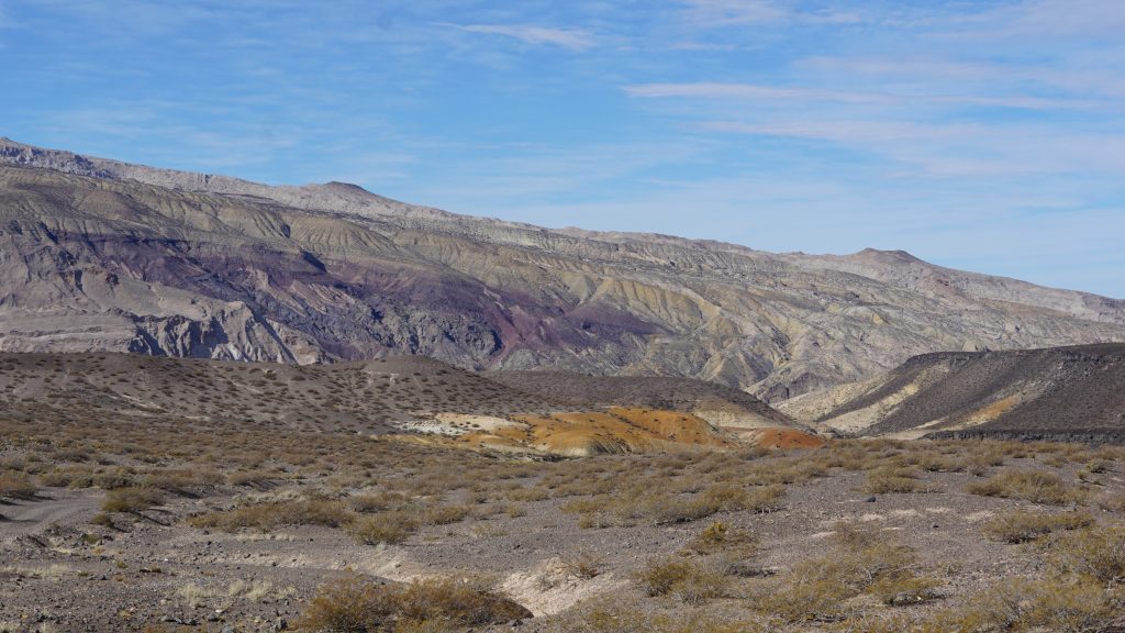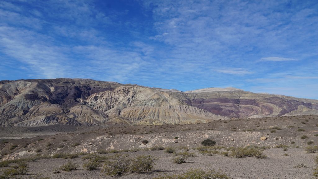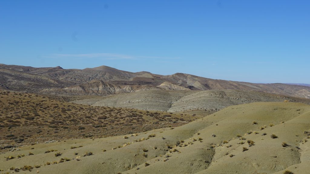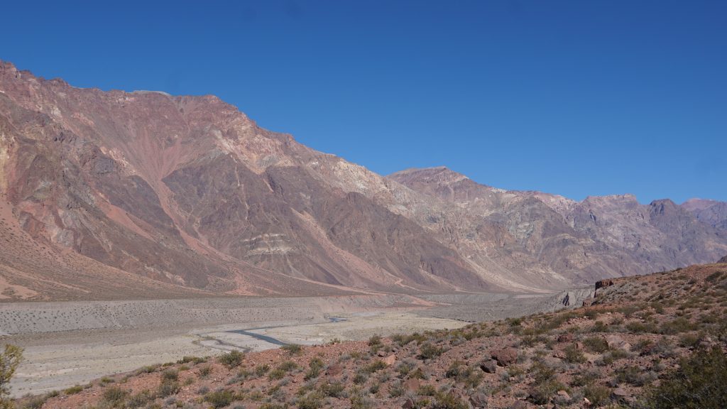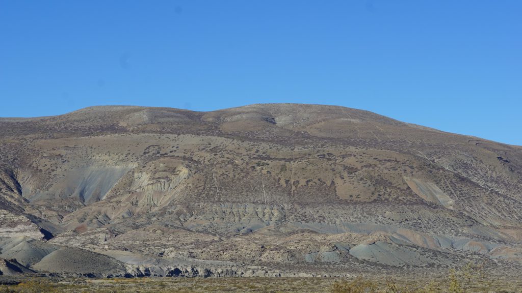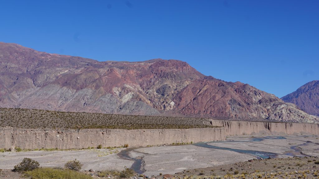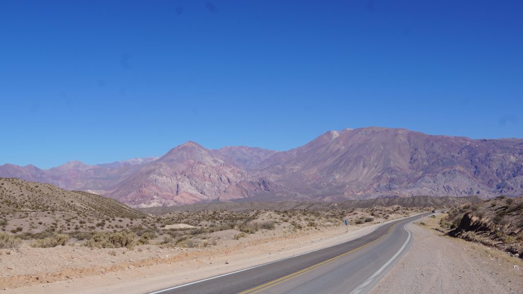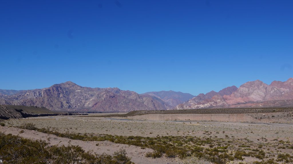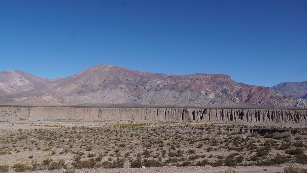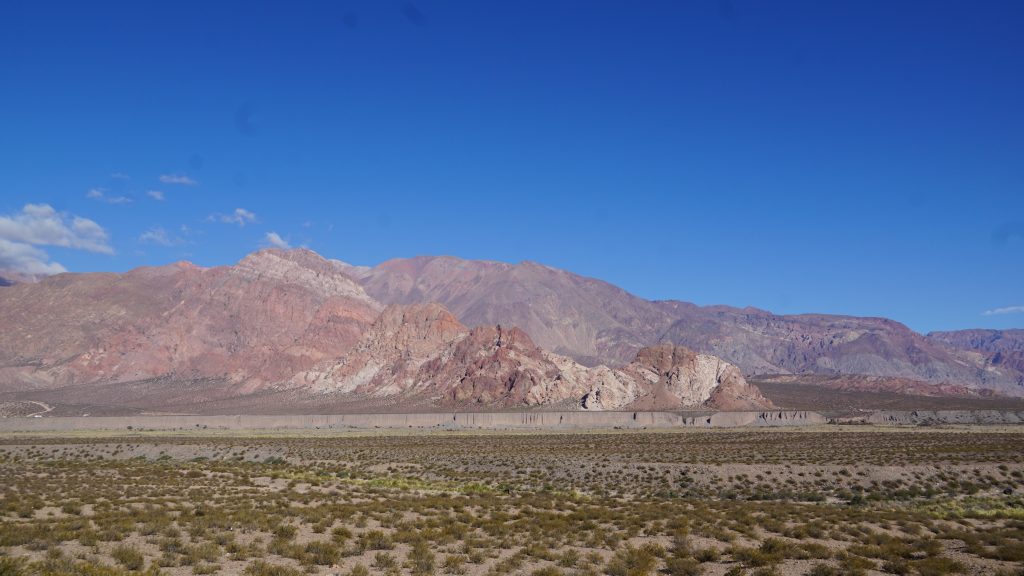 Dann ging es weiter auf der Ruta 40. Wir fahren immer in einer Höhe um 1000HM, man könnte es fast als Wüstental bezeichnen. Ringsherum immer wieder Berge der unterschiedlichsten Formen. Einmal sehen sie aus wie Dinosaurierrücken, dann wieder spitz, wie kleine Vulkane oder wie Pudding, der noch nicht ganz fest aus der Form geholt wird. Es ist nichts Langweiliges dabei, ein Farbspiel ohne Ende.