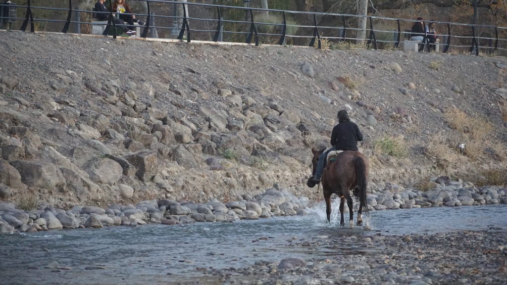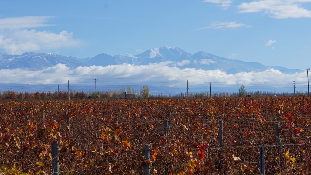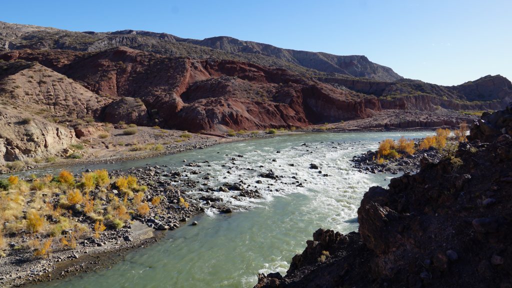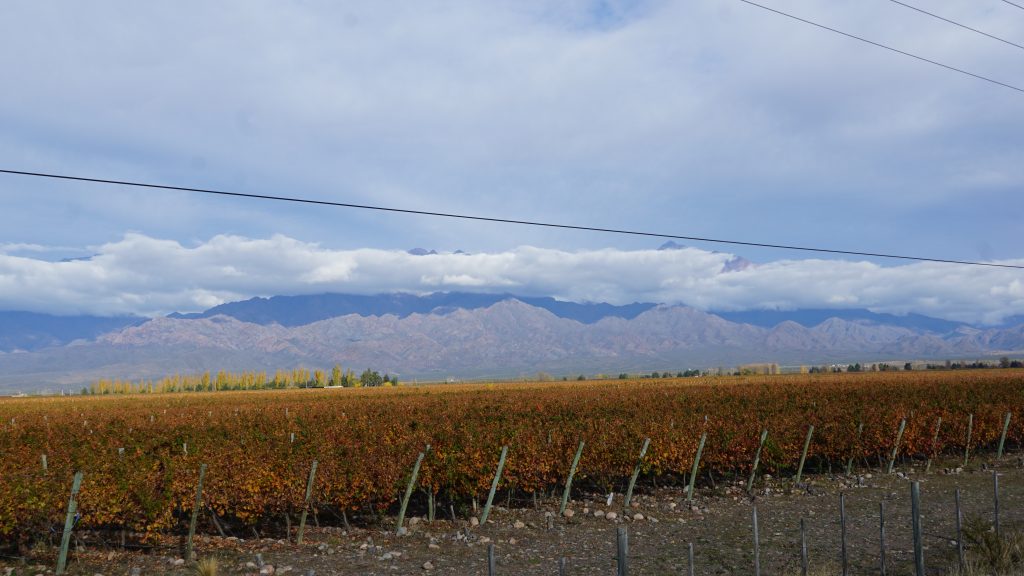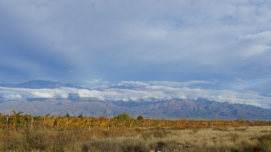 Heute ging es dann über das „Valle de Uco“, eines der markantesten Weinanbaugebiete Argentiniens nach Mendoza. Immer entlang an den westlich liegenden Anden und auf beiden Seiten der Straße riesige Weinfelder. Die Chaussee ist eingerahmt von Pappeln und rechts und links fließt das Wasser der Anden in Kanälen entlang.