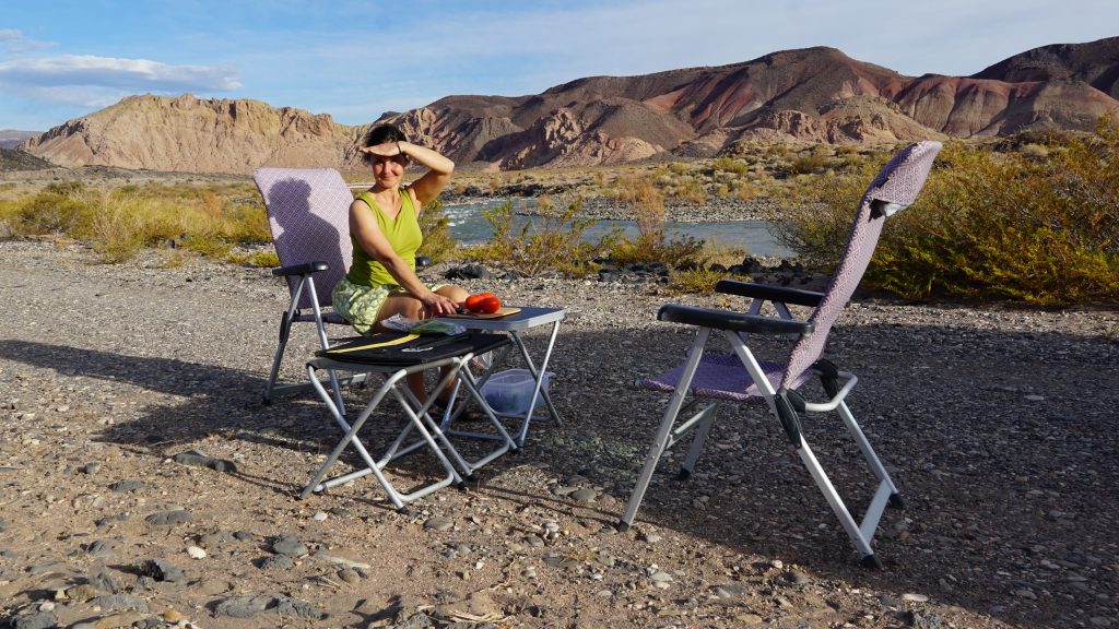 Es war schon wieder 18:00, weiter wollten wir nicht mehr. Nun stehen wir hier am Rand von Chos Malal, an einem Seitenarm des Rio Neuquen und konnten sogar für den Abend noch Tisch und Stühle aufstellen.