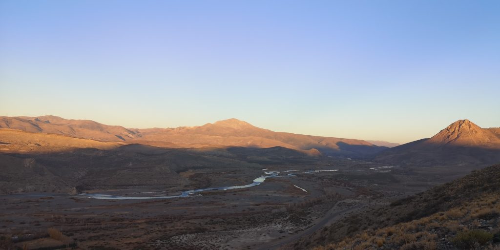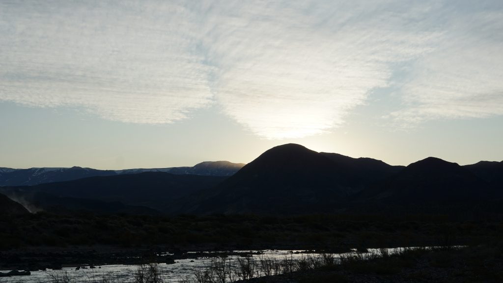 wir stehen ganz allein am Rio Grande, mit Blick auf Vulkane und Berge, die zu jeder Abendstunde ihre Farbe wechseln. Es ist 20:00 und wir haben draußen noch 25°C und es weht ein warmer Fön. Der Himmel ist voller Sterne, aber nicht nur über uns, sondern bis zum Horizont. Wie cool ist das denn!