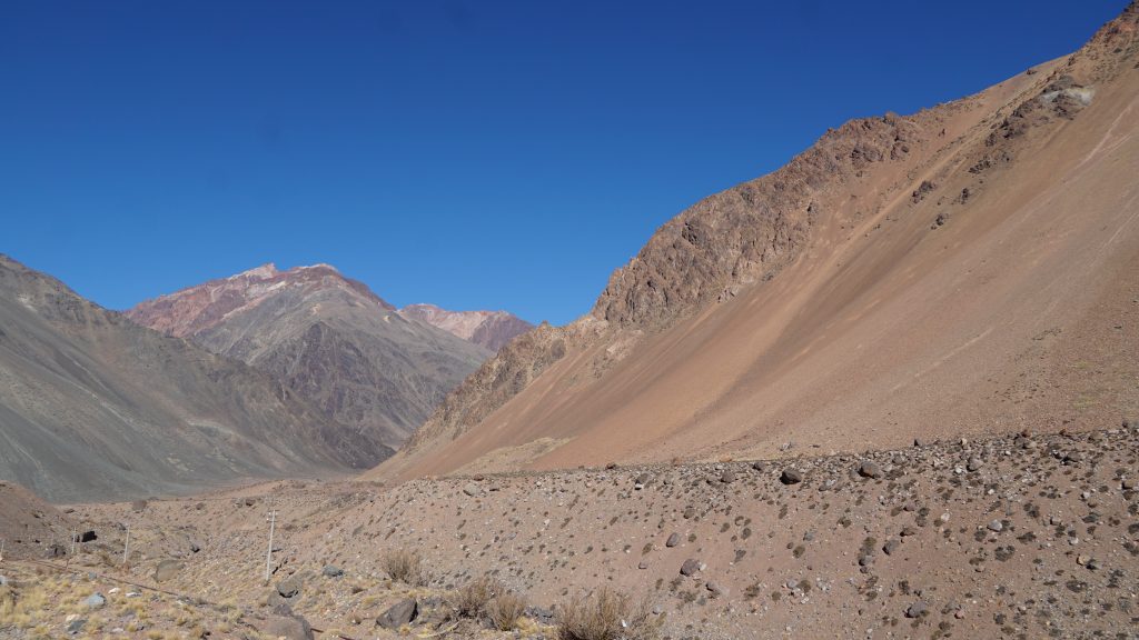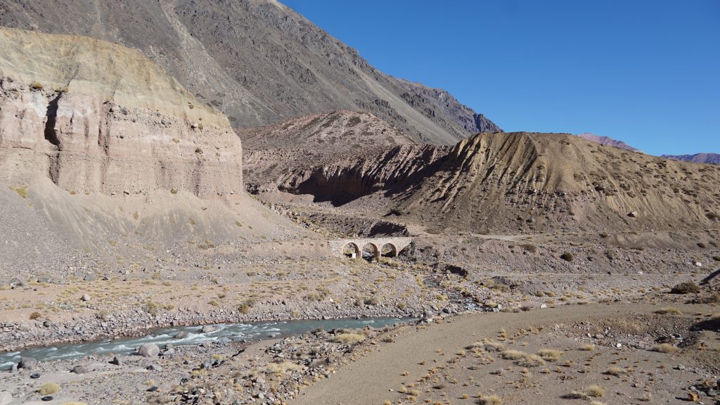 Wieder einmal liegt eine sehr abwechslungsreiche Strecke hinter uns. Es ging auf der Ruta 7 auf einer Hochebene (zwischen 1400 und 2000 m) zwischen den Bergmassiven der Anden entlang. Im Norden und Süden die Anden und unterhalb in einem Canyon der Rio Mendoza. Und die alte Bahnlinie verlief ebenfalls parallel zur Straße. Sie musste allerdings an vielen Stellen der Ruta 7 weichen und verfällt immer mehr. Wir haben schon überlegt, ob wir daraus nicht eine Draisinenstrecke planen sollten. Das Potenzial hätte sie auf alle Fälle.