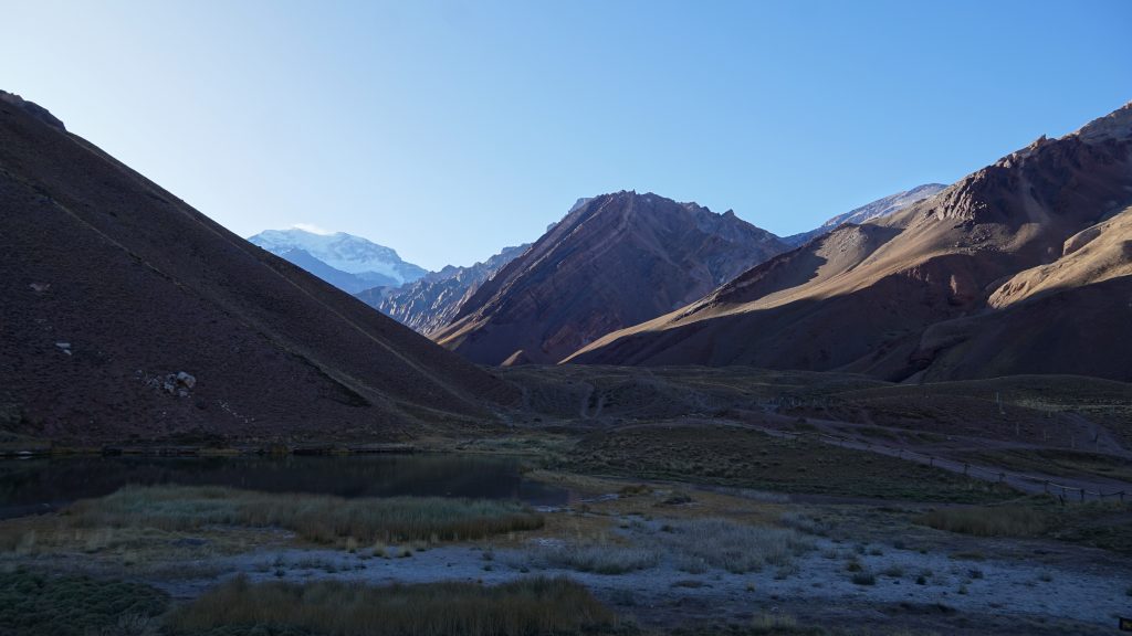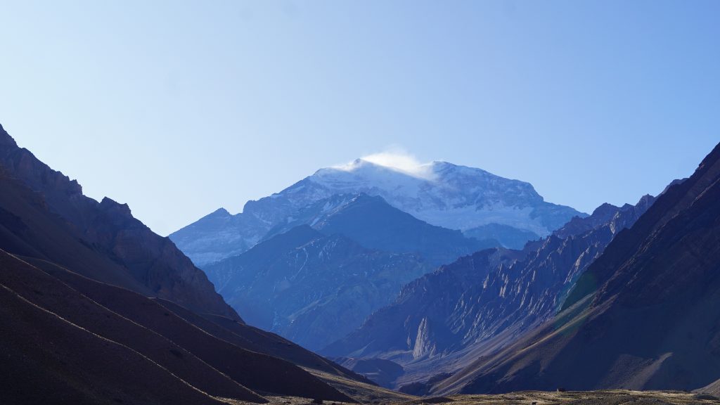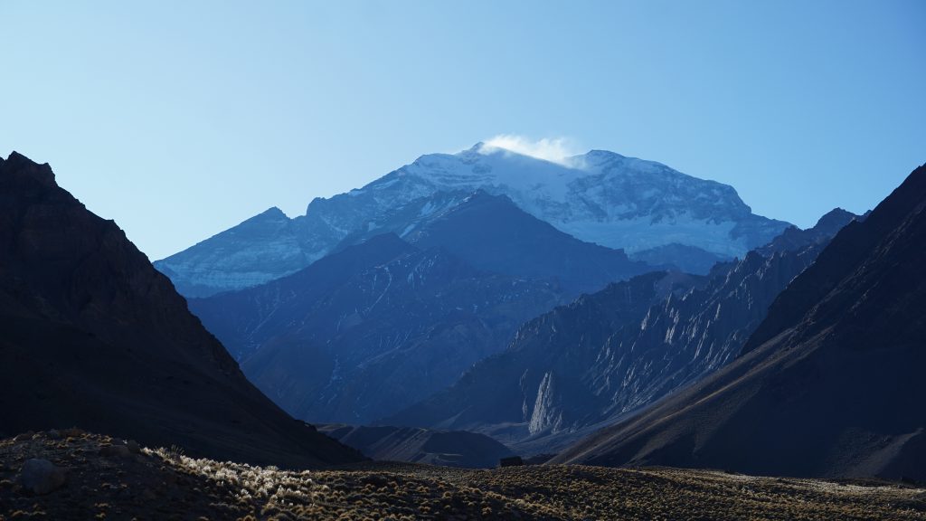 Das besondere an der Ruta 7 ist der Blick auf den höchsten Berg Amerikas, der auch gleichzeitig der höchste Berg außerhalb von Asien ist, der Cerro Aconcagua (6960 m). Das Wetter spielte mit, wir hatten einen tollen Blick auf die Spitze und den darunter liegenden Gletscher. Natürlich war das nicht vom Auto aus möglich, sondern wir mussten noch ein Stück in den Nationalpark laufen. Dieser macht bereits um 16:00 zu, es war aber schon 16:15. Wir hatten Glück und durften trotzdem noch rein und die Tour laufen. Dabei spürten wir schon die 3000 HM, denn wir pusteten ganz schön. Oder wir sind alt geworden und es fehlt uns das Training.