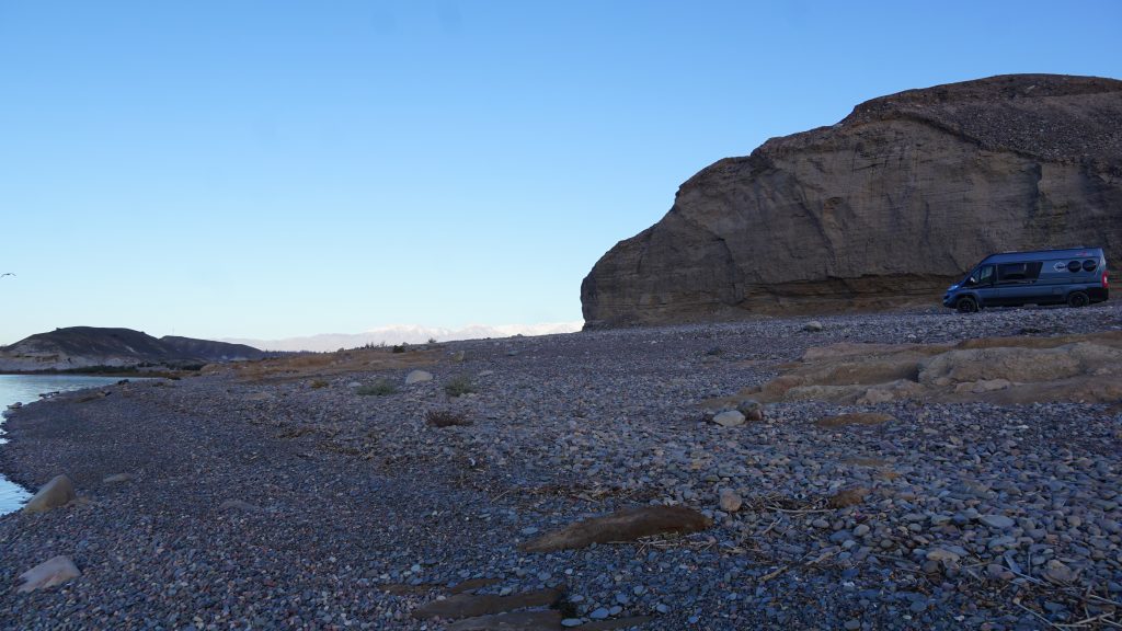 Noch einmal konnten wir leider nicht dort stehen, aber es findet sich immer ein Plätzchen. So stehen wir 4 km weiter windgeschützt. Es kommen zwar noch ein paar Autos vorbei, aber das gibt sich, wenn die Therme schließt.