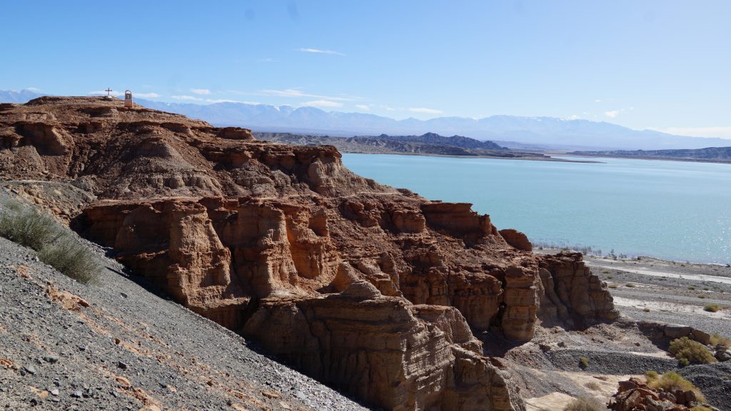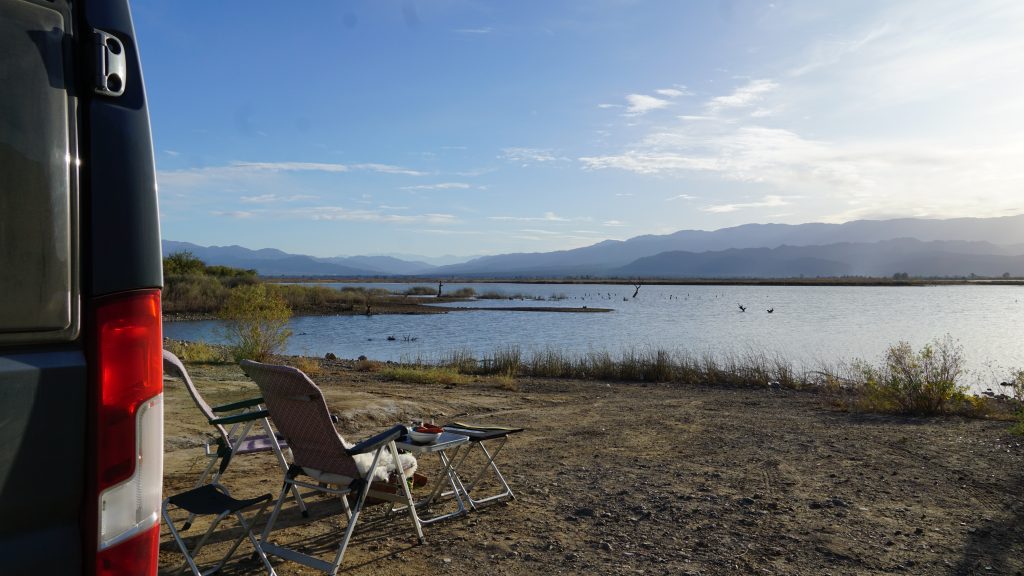 Aber unser Platz ist wieder Top! Wir stehen in der Nähe von Rodeo am Dique Cuesta del Viento. Überall Werbung zum Surfen und Kitesurfen. Das können wir total nachvollziehen, denn es weht wieder eine steife Brise. Die Wellen sind doch etwas stärker, so dass wir das Baden auf morgen verschoben haben.