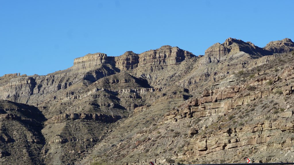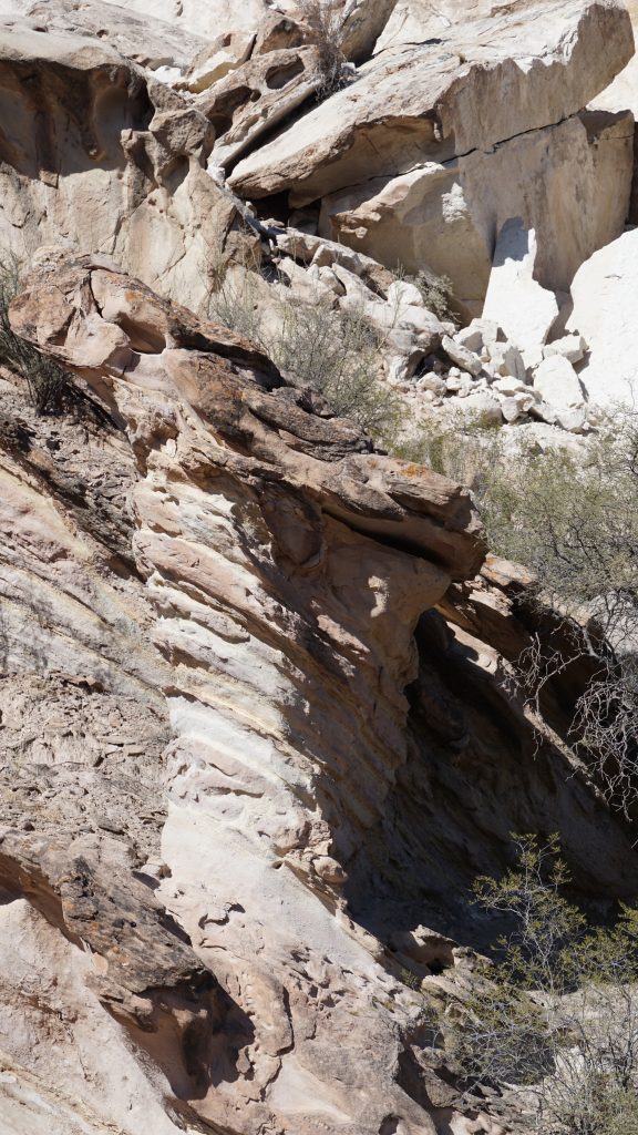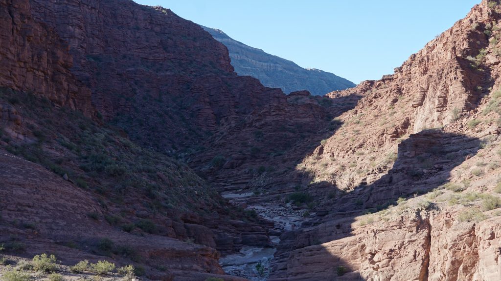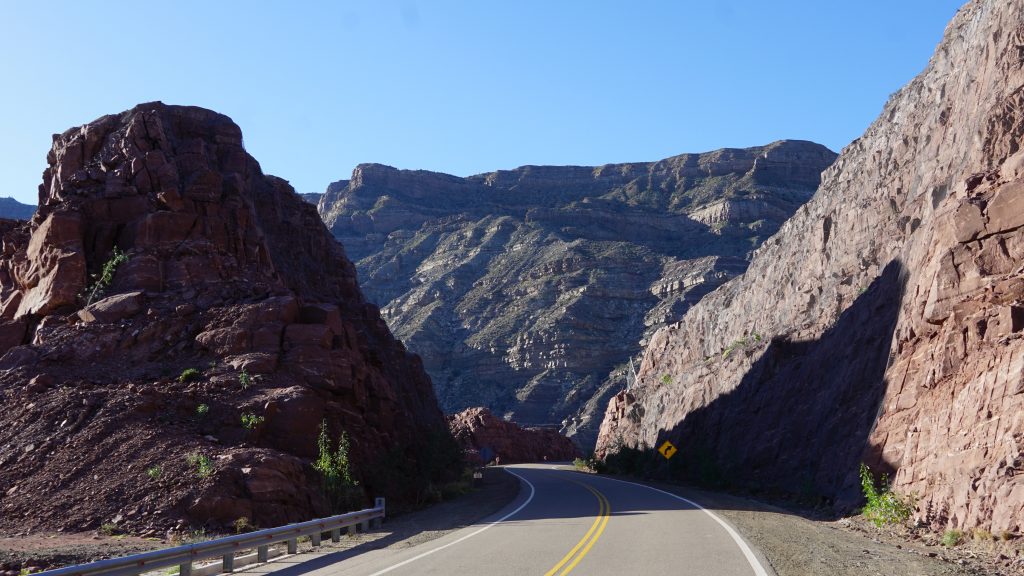 Dann ging es weiter auf der RN150, die zu beschreiben schwer fällt. Gesehen haben wir ja schon einige wunderschöne Felsformationen. Hier war es noch einmal anders. Eine schmale Straße durch ockerfarbenen Felsen. Plötzlich wechselte die Farbe in das typische rot. Die Straße (3,8m breit) schlängelte sich an den Felsen entlang empor. Zwischendurch tiefe Canyons und plötzlich ist man auf dem Pass und fragt sich, wo die Felsformationen hin sind. Wir fahren auf 1500m, rechts und links Sand und Kakteen und im Hintergrund doch wieder Berge und eine rote Wand. Es war einfach faszinierend. Wir kamen nicht vorwärts bei so vielen Stopps, die wir einlegen mussten.