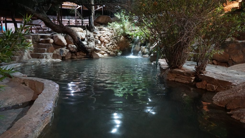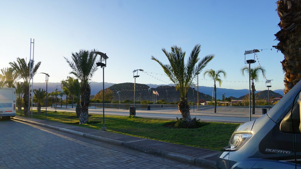 Gestern Abend sind wir noch bis zum Haupteingang der Therme gefahren (auf dem Gelände darf man nicht übernachten). Dort stand schon ein Camper, so stellten wir uns einfach dazu.