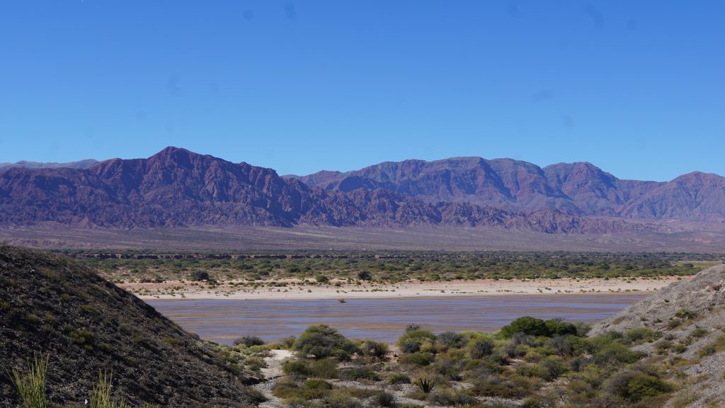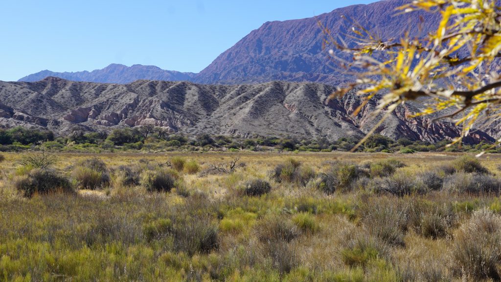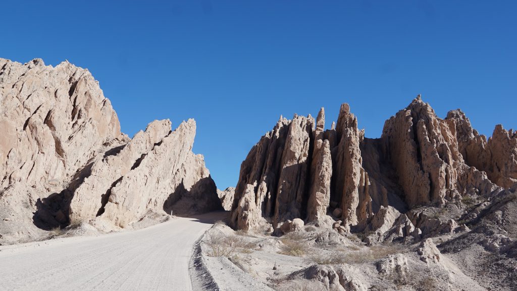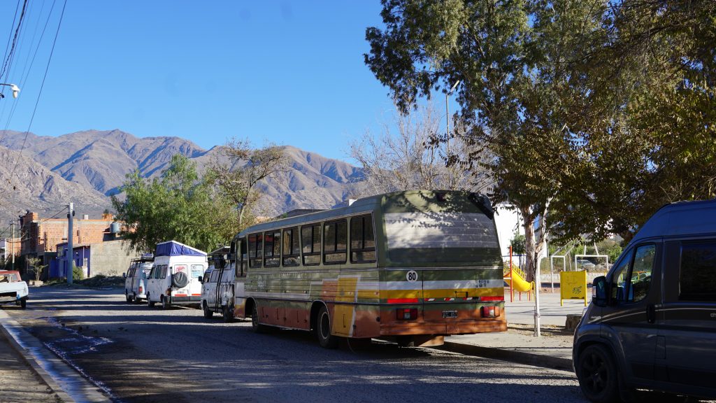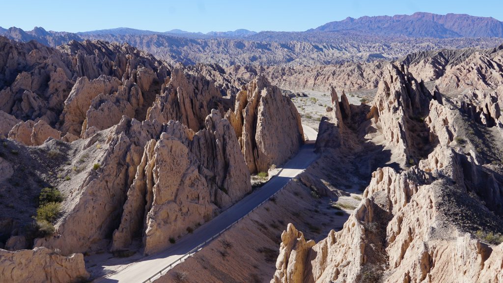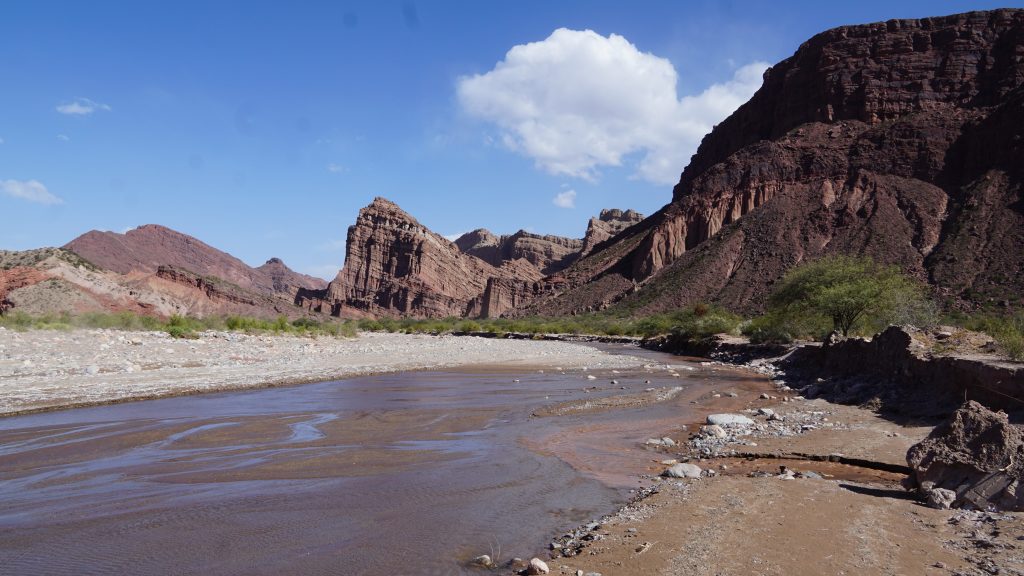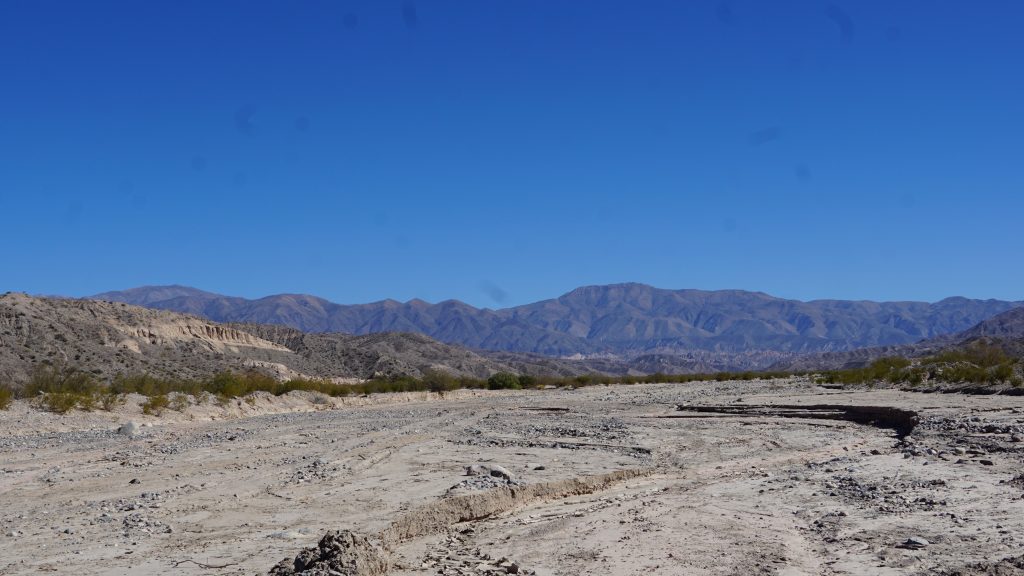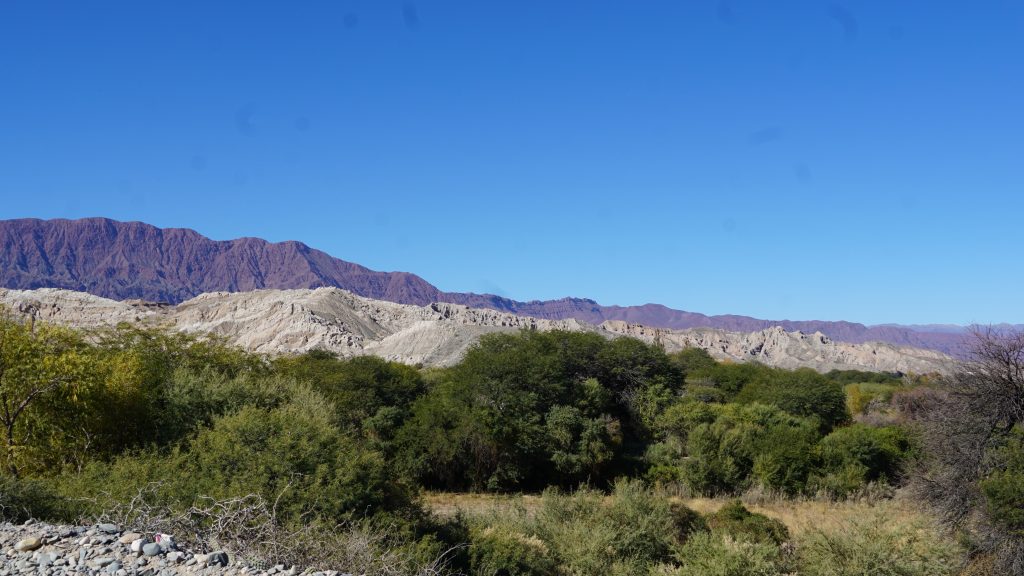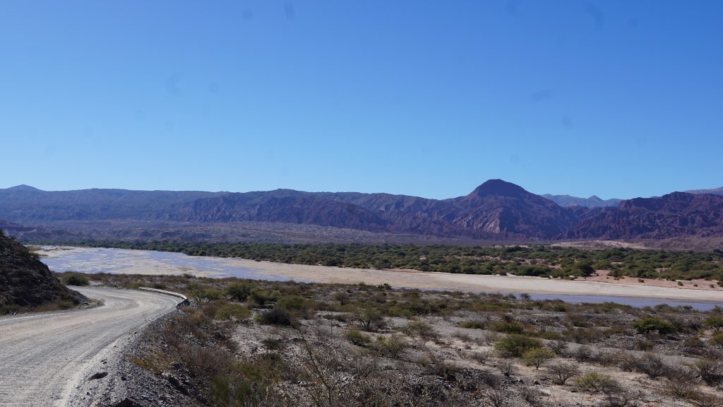 Celso und Carla haben uns ein Video über die Ruta 68 nach Salta gezeigt und sofort kamen Zweifel auf, ob diese Strecke nicht schöner ist. Wir sind bei unserer Entscheidung geblieben und bereuen es nicht. Es ist der absolute Wahnsinn. Wir kommen nicht weiter. Immer wieder müssen wir anhalten, um zu fotografieren oder die Umgebung einfach nur zu inhalieren. Immer wieder ändernde Berg- und Farbformationen. Scharfe Spitzen, dazwischen tiefe Spalten und das meiste aus Lehm. Staub ohne Ende, aber dann ein Fluss, der die Straße kreuzt und viel Grün ins Bild bringt. Es ist unbeschreiblich. Was wir unserem Camper damit antun, darüber möchten wir lieber nicht nachdenken. Die Straße (Schotterpiste) ist in einem wirklich schlechten Zustand und der Staub und die trockene Luft geben den Rest dazu.