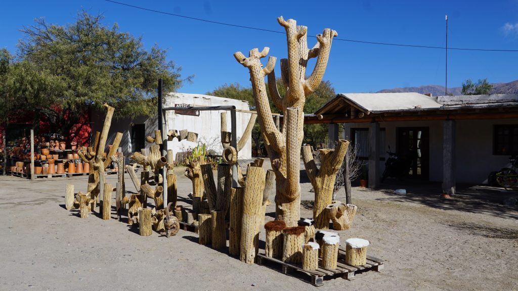 Planänderung, es geht nicht auf den Paso San Francisco. Es zieht uns doch weiter in den Norden, die Wärme ruft. Spätestens, wenn wir Richtung Atacama-Wüste (Chile) fahren, kommen wir auch über eine Asphaltstraße auf 4800m. Also zurück auf die Ruta 40 Richtung Cafayate. Bis Belén war es nicht die interessanteste Strecke. Die Ruta 40 bildete ein Band am Horizont. Abseits der Straße war es zwar grün, doch es änderte sich vom Straßenbild nicht allzu viel. Gut zum Strecke machen, wenn nicht immer ein paar kleine Orte mit ihren Artesanales (regionales Kunsthandwerk) zum bremsen zwingen würden. Aber genau deshalb sind wir ja auch hier.