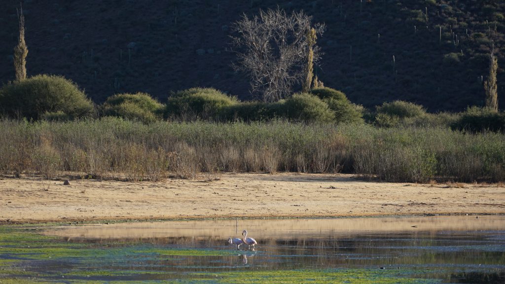 Die Vögel, die gestern noch fehlten, haben sich heute früh noch dazu gesellt. Zwei Flamingos standen plötzlich, mit dem gebührenden Abstand zu uns, an der Lagune. Was will man noch mehr?
