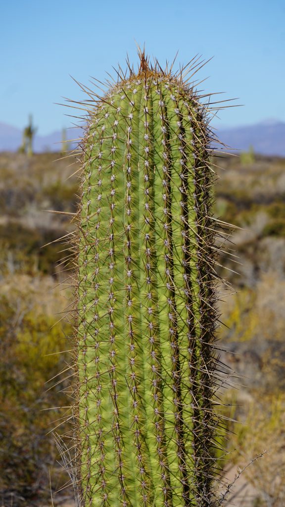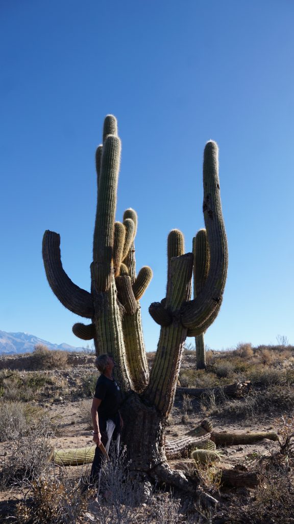 Landschaftlich erinnert mich die Gegend an Western-Comics. Ich hätte mir nicht vorstellen können, dass die Zeichnungen der Realität entsprechen. Aber genau so sieht es hier aus. Überall die Kandelaber-Kakteen, auch direkt am Straßenrand. Mit einer Höhe, unglaublich! Im Hintergrund die 4000er, teilweise schneebedeckt.
