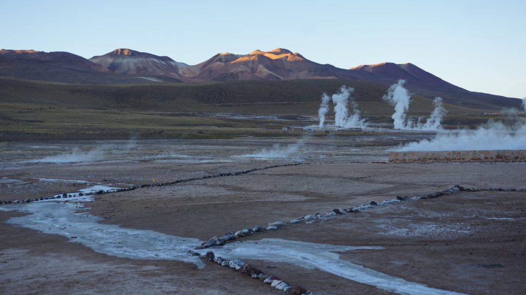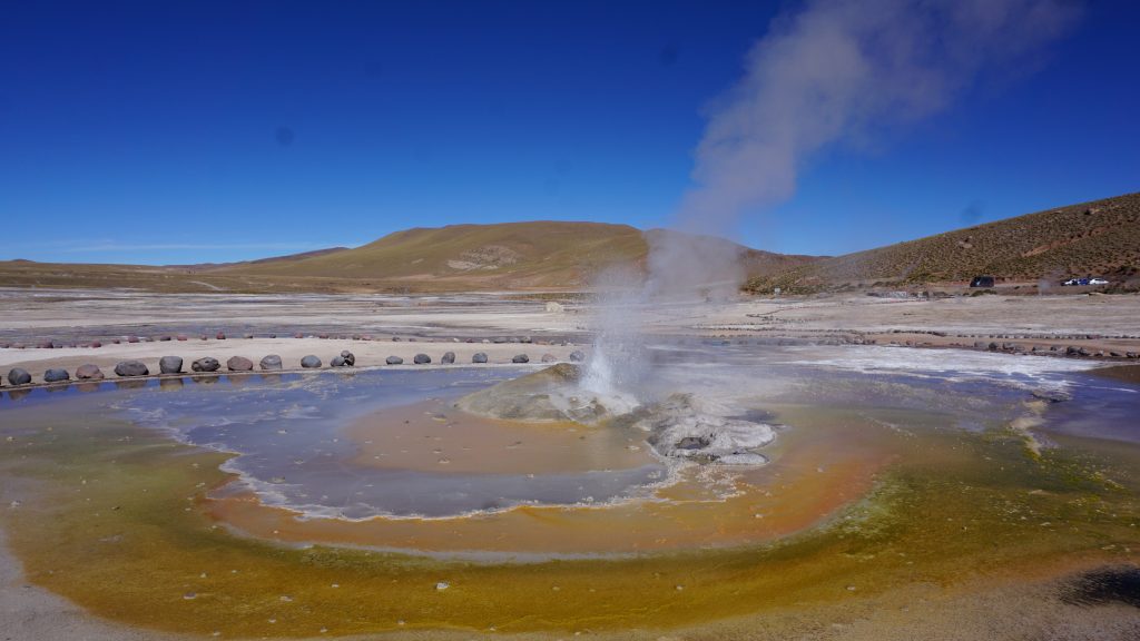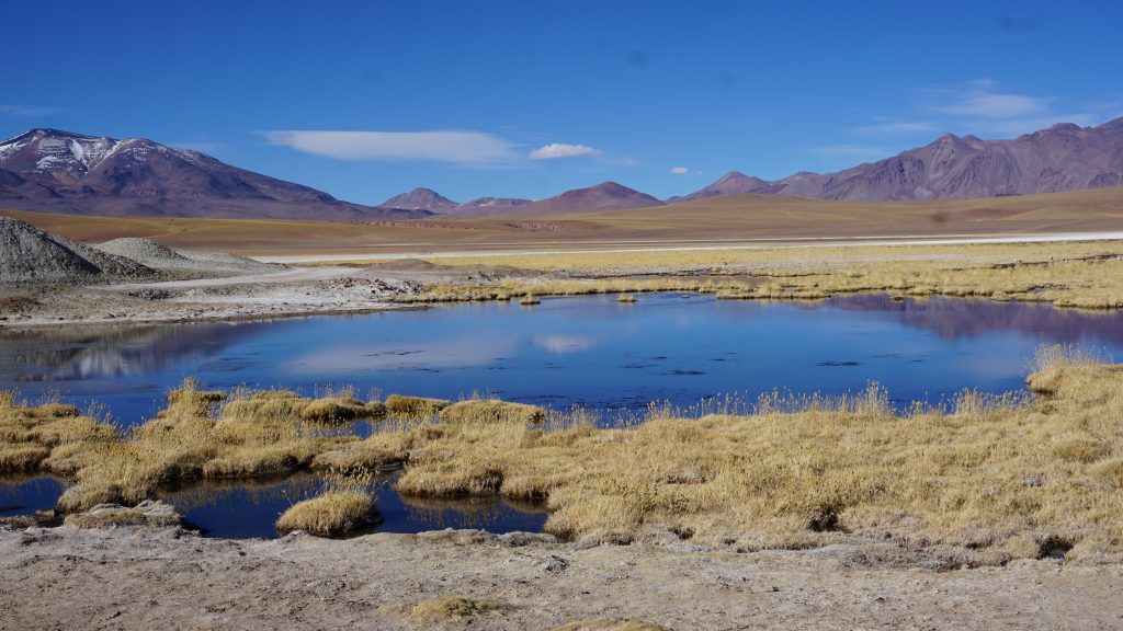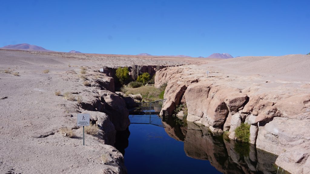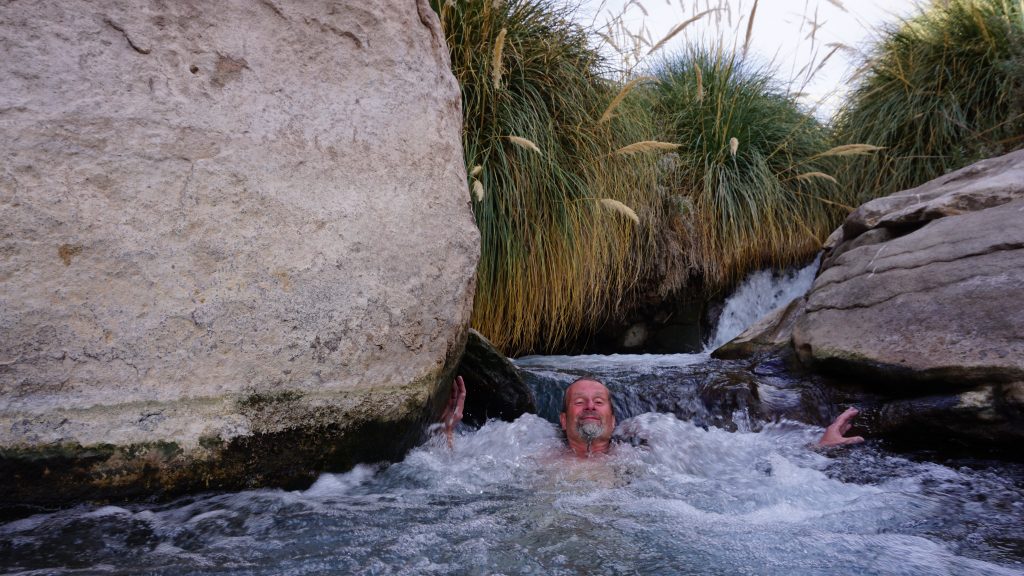Wir sind auf einer Höhe von 3400m. Im Hintergrund die Atacama-Wüste und ringsum um uns herum ragen die Vulkane in die Höhe. Die Sonne scheint und wir baden in einem kleinen Fluss mit warmem Wasser.