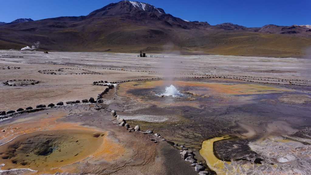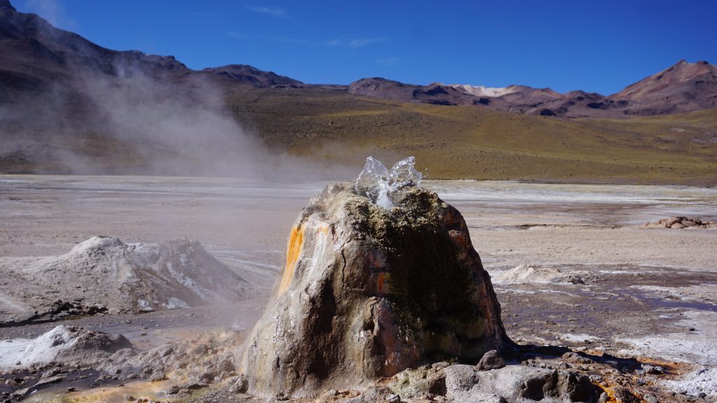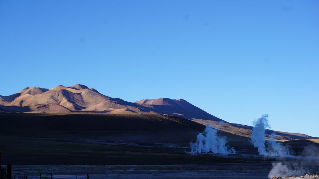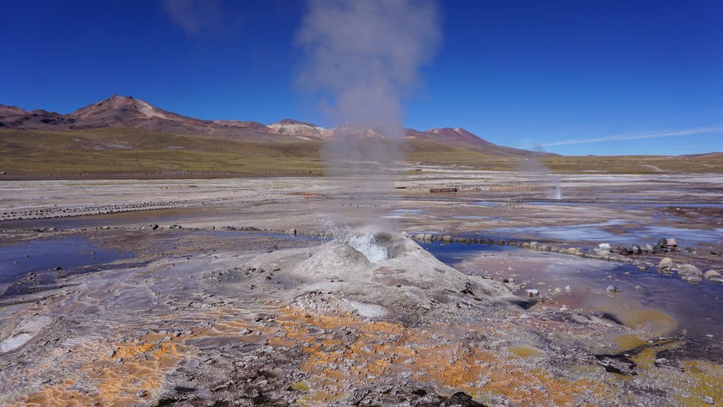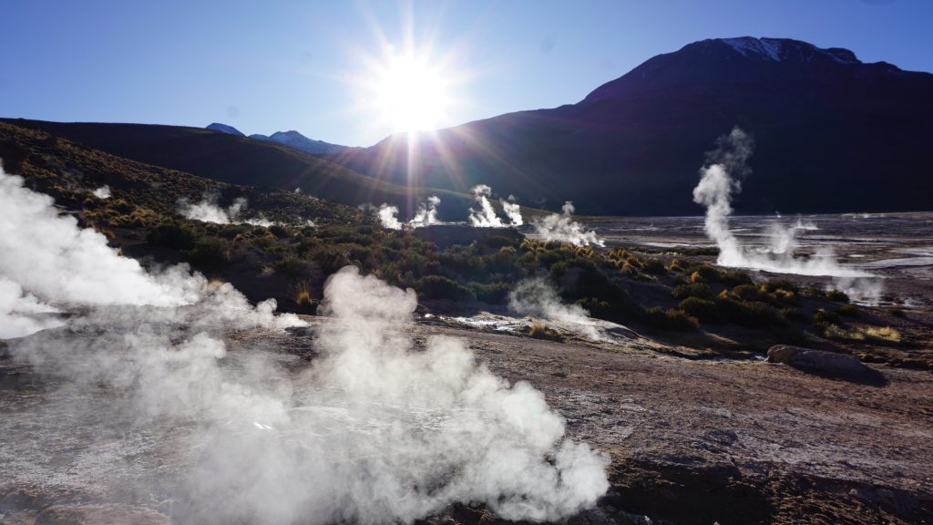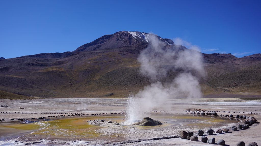 Wir sind auf einer Höhe von 3400m. Im Hintergrund die Atacama-Wüste und ringsum um uns herum ragen die Vulkane in die Höhe. Die Sonne scheint und wir baden in einem kleinen Fluss mit warmem Wasser.