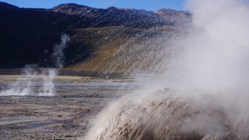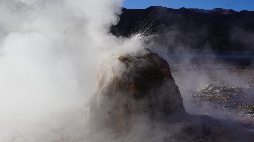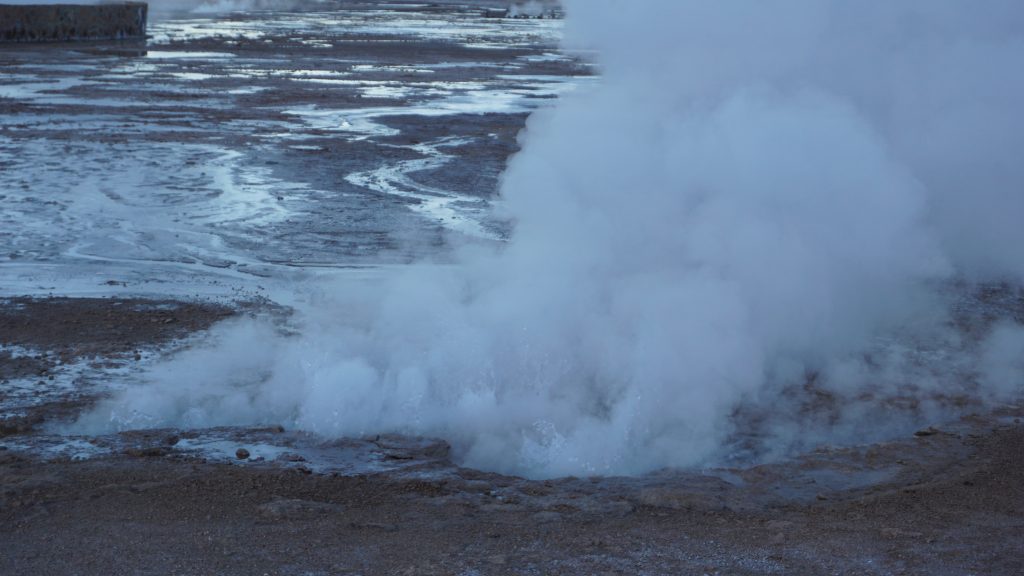 Das Spektakel vor Ort beginnt kurz vor Sonnenaufgang. Über die gesamte Fläche des Geysirfeldes steigen Dampfschwaden und Fontänen auf. Ein echt beeindruckender Anblick, der aber bis maximal um 09:00 anhält, dann ist es vorbei. Also ist für die Busfahrer Eile geboten. Alles was im Wege ist stört und da sind die Kollegen echt schmerzfrei.