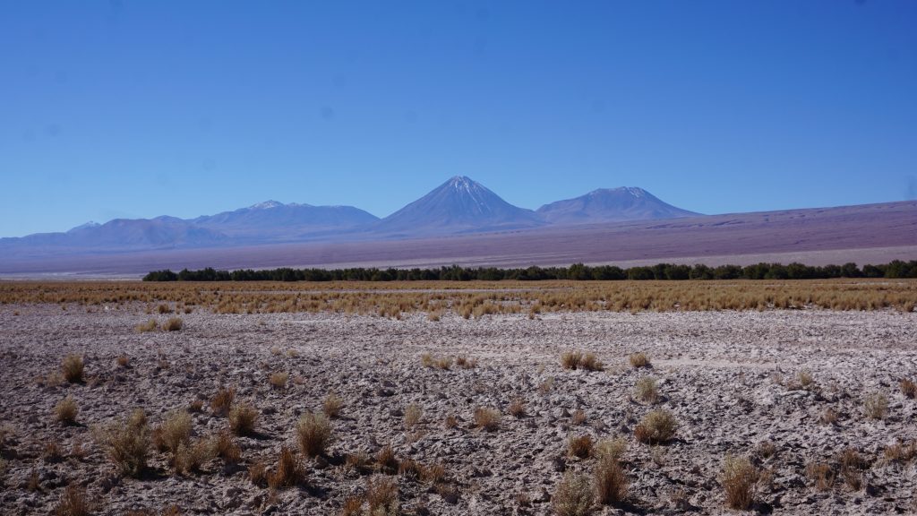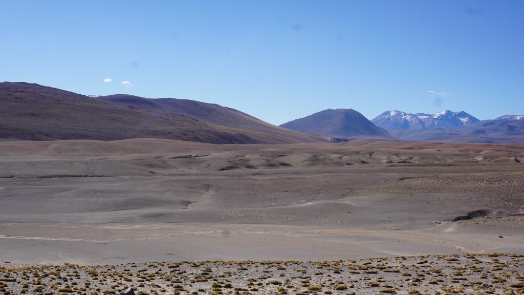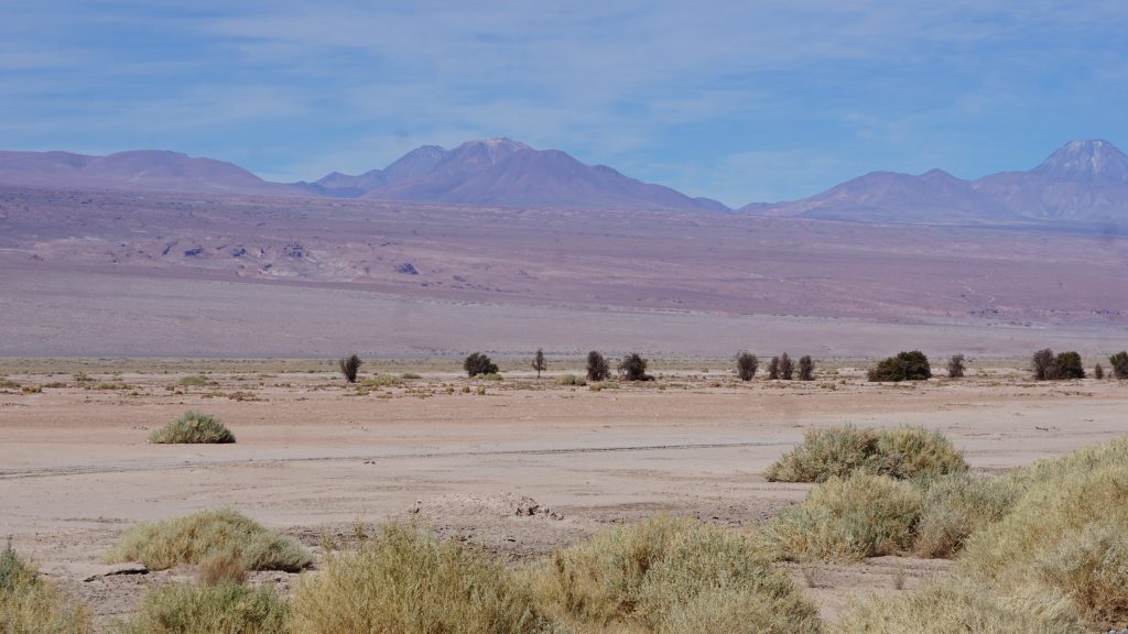 Beeindruckend war die Fahrt aus der Oase San Petro de Atacama bis zum Park. Kaum ist man aus dem Ort heraus, verschwindet alles Grün. Es wird noch trockener und die Weite geht ins Unendliche. Abseits der Straße wird es immer sandiger. Die Vegetation hört plötzlich auf. Dann wird der Boden immer salzhaltiger (grau) und plötzlich gibt es auch wieder flache Büsche.