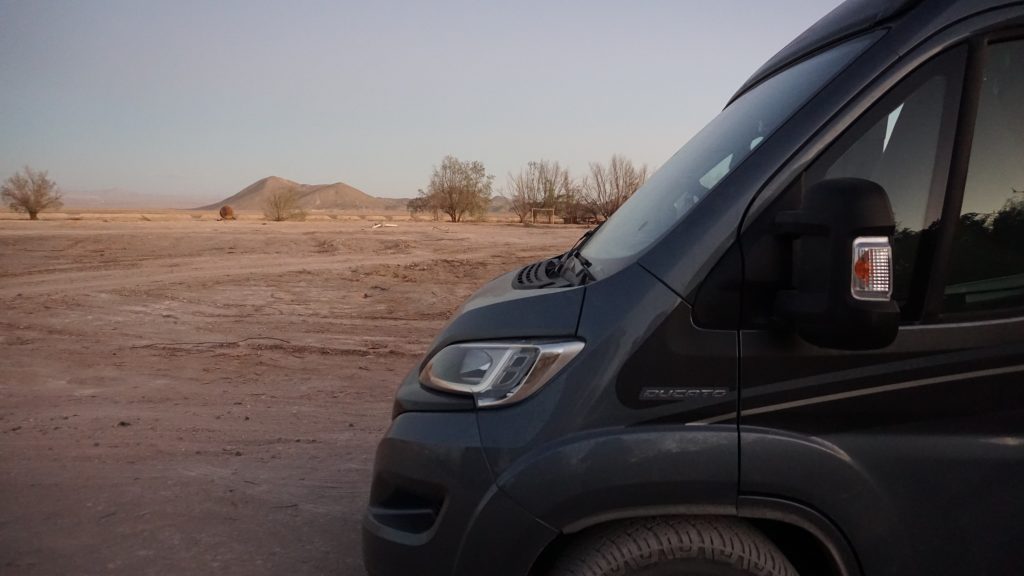 Die CH-25 ähnelt schon fast einer Autobahn und Übernachtungsplätze sind etwas rar. Wir stehen jetzt in Sierra Gordo an einem Picknickplatz, dessen bessere Tage schon etwas her sind. Wir fragen uns warum! Hier in der Wüste, ein wunderschöner Ort mit Palmen. Das Wasser fließt unkontrolliert aus kaputten Rohren durch den Park und keinen interessiert es.