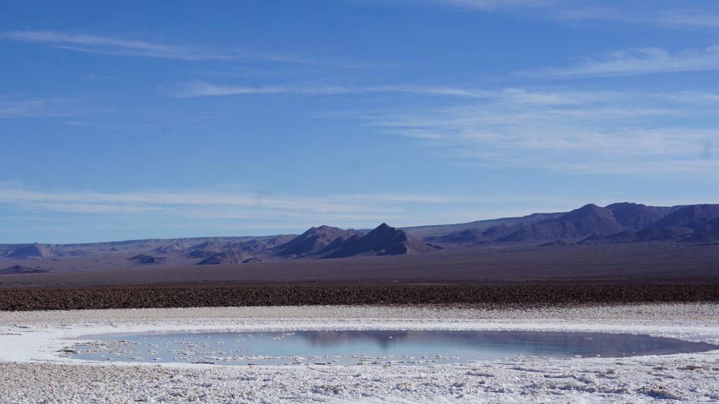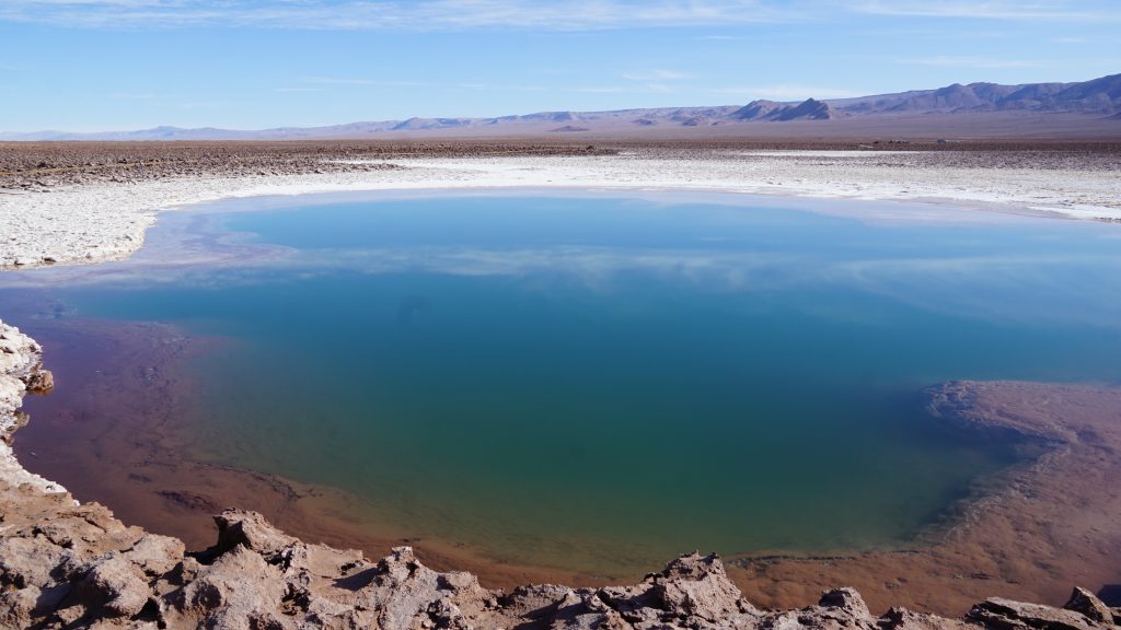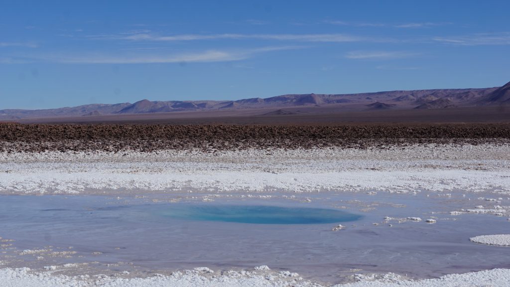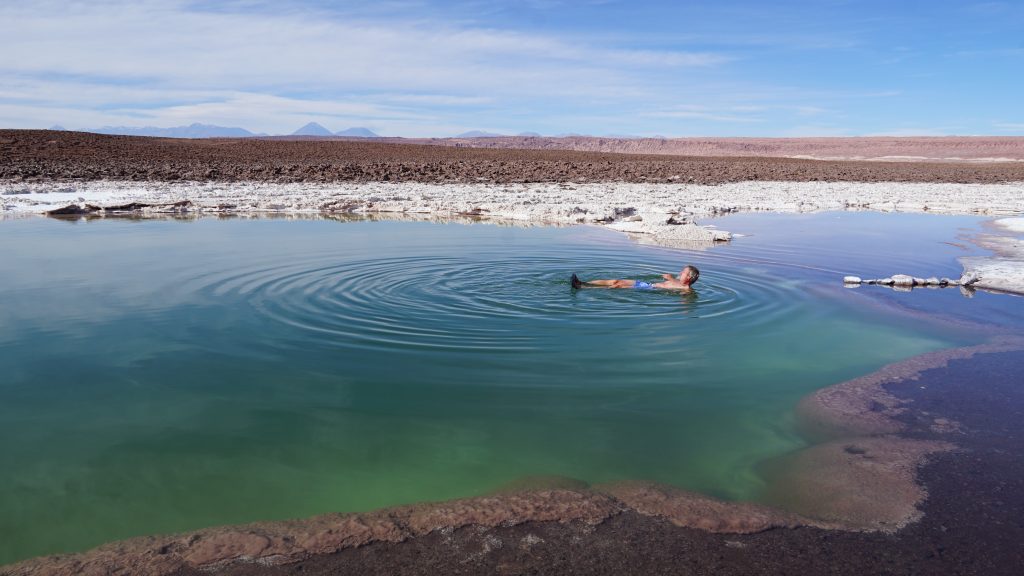 Die Laguna Baltinache liegt mitten in der Atakamawüste und besteht aus 7 Salzseen. In einer von diesen kann man sogar baden. Das war natürlich ein Anreiz für uns.