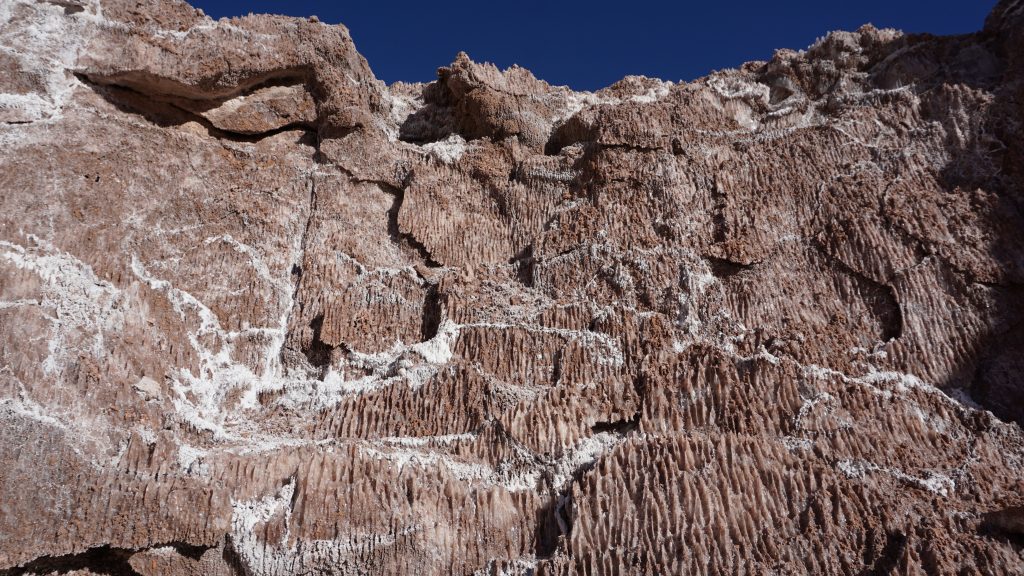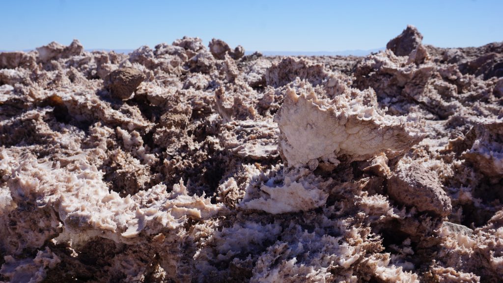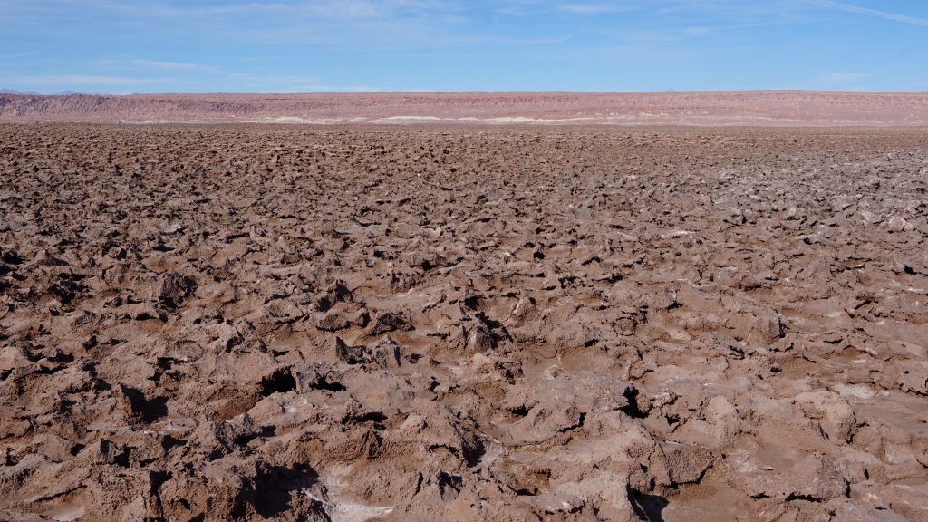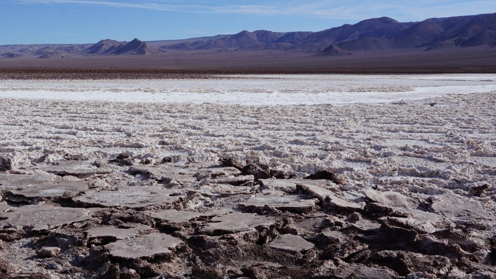 Und es gibt doch Geräusche in der Wüste, vielleicht nicht nachts, aber tagsüber. Die wasserführenden Lagunen waren ein paar Meter weg. Diese paar Meter waren das reinste Salzmeer. Keine einzelnen Salzkristalle, sondern Salzbrocken. Wenn man auf diese klopfte, hörte es sich absolut metallisch und hohl an. Durch die Sonnenerwärmung und entsprechende Ausdehnung waren diese Geräusche immer wieder zu hören.