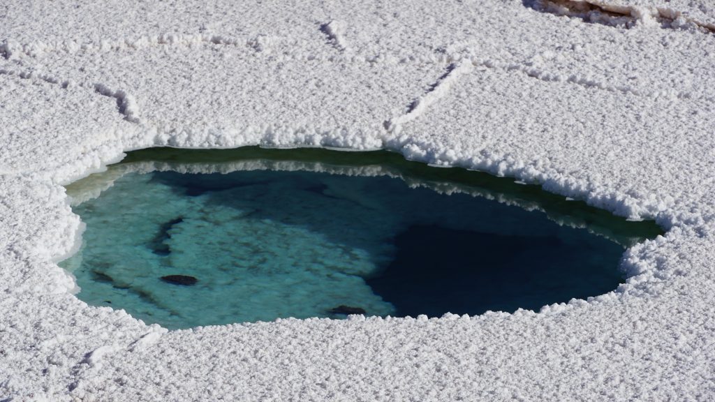 Dann waren wir an den Lagunen, der erste Blick war ernüchternd, der zweite schon nicht mehr. Man spricht von den versteckten Lagunen. Ringsherum dunkler, trockener, aufgebrochener Lehm und dazwischen das Weis des Salzes und das türkisblau der Lagunen. Anstatt auf weisem Schnee, laufen wir hier auf weisem Salz. Knirschen und blenden tut es genauso. Dann ging es ins Wasser. Darauf vorbereitet, dass es kalt ist, waren wir und es störte uns nicht. Die Sonne schien ja warm. Der Salzgehalt ist höher, als im toten Meer. Wir liegen ein paar Minuten auf dem Wasser, ohne jegliche Bewegung. Wie cool ist das denn!?