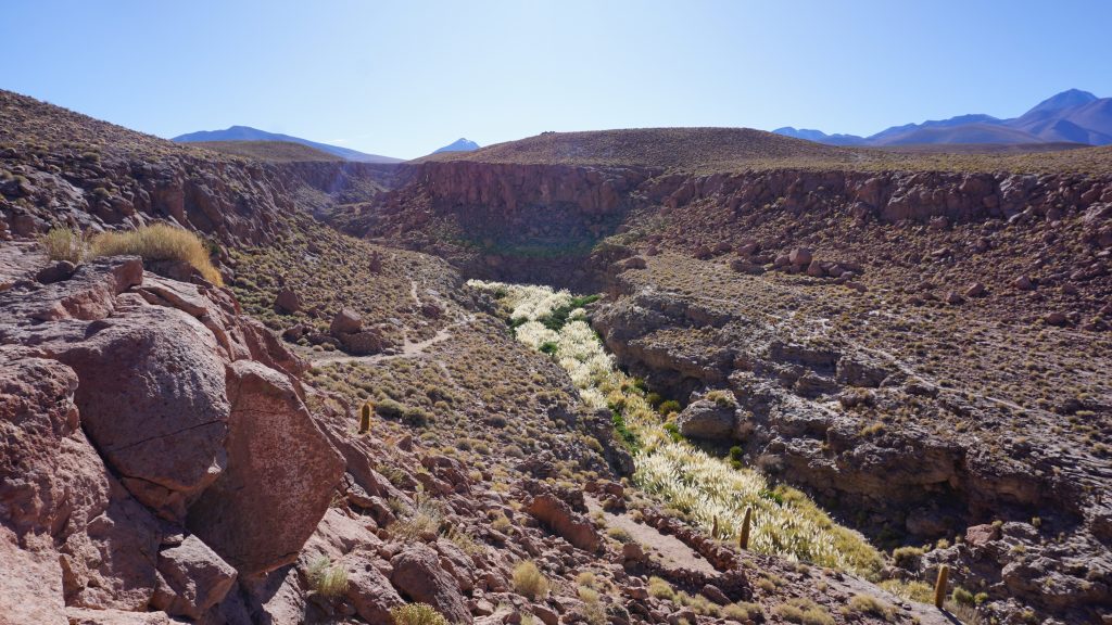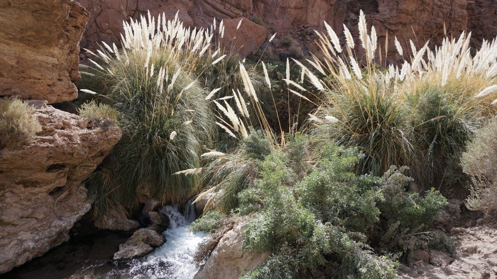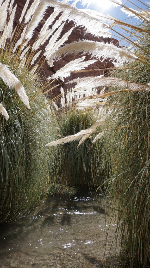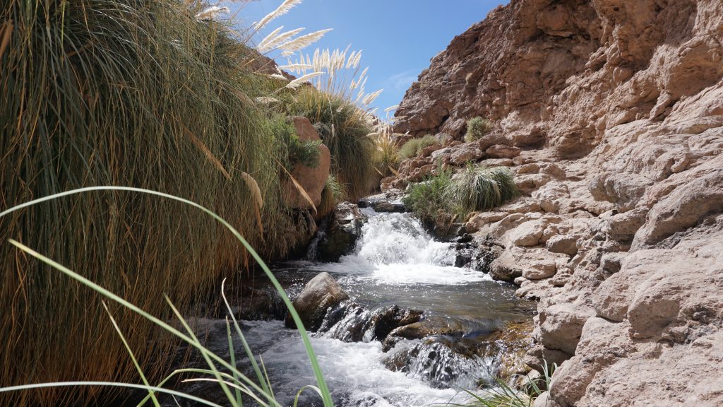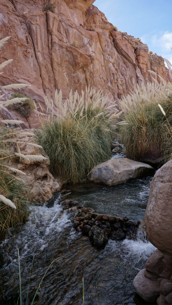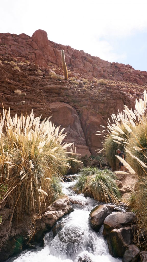 ich hatte bloß schon einmal nach einem Übernachtungsplatz (iOverlander) für heute geschaut und dann sah ich das: „Better than Termas de Puritama“. Was für ein magischer Ort! Eine Oase in der Quebrada Escalera. 10m unter uns war alles grün, Riesen-Pampasgras wuchs und wir hörten Wasser plätschern. Wie cool ist das denn?! Wir standen an unserem Camper und wussten, dass der Tag heute gelaufen ist. Endlich Wasser nach gefühlter Ewigkeit in der Wüste.