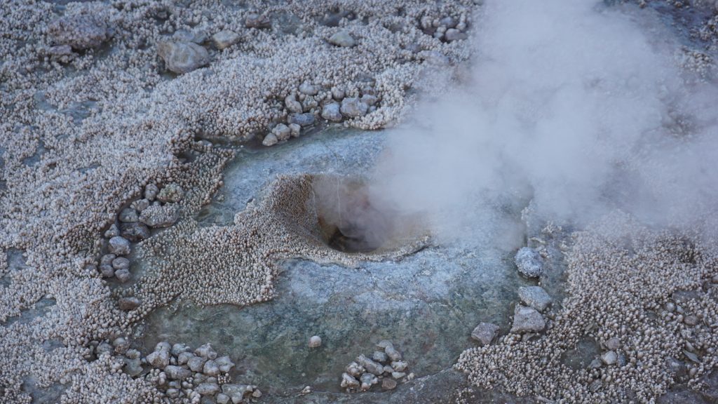 Gut, dass wir Zeit ohne Ende hatten. Na vielleicht nicht ganz, denn um 18:00 schließt der Park. Aber an einer Quelle konnte man ganz gut sitzen. Diese sprudelte und schoss immer wieder kochend heiße Fontänen in die Luft. Ein kleiner Windzug wehte den sehr warmen Wasserdampf dann immer in unsere Richtung. Einfach herrlich, wir waren zwar leicht nass, aber es fühlte sich an, wie in einer Dampfsauna.