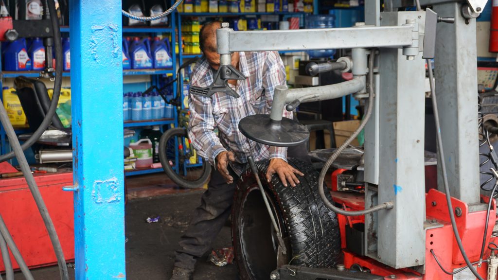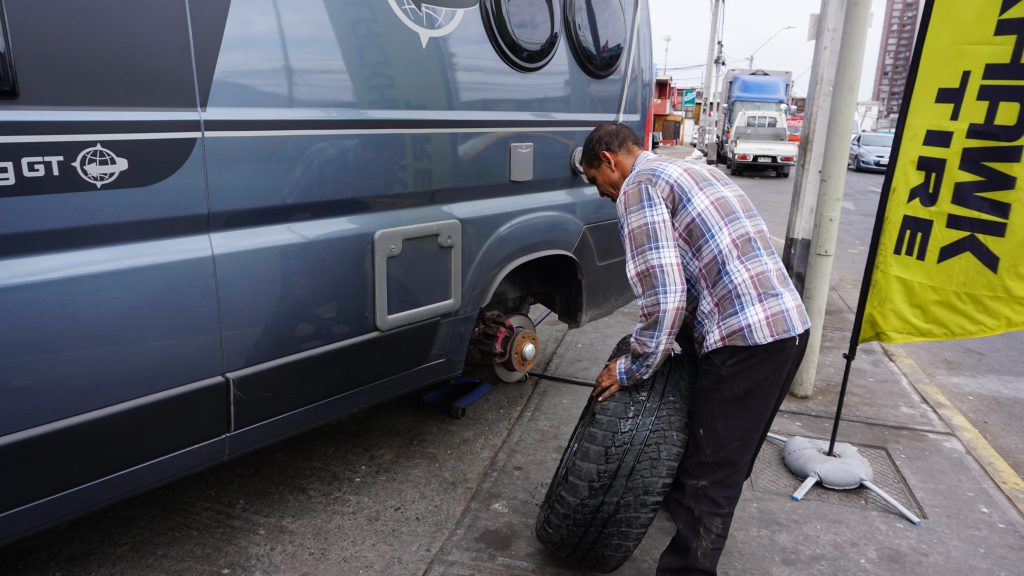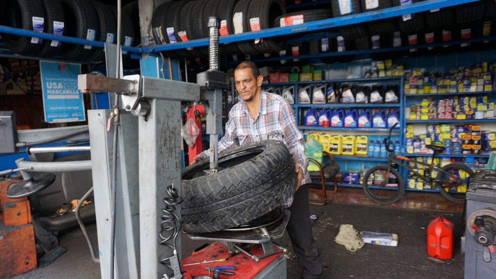 wieder einmal die Menschen unterschätzt, auf Grund unserer europäischen Maßstäbe und alles besser zu können. Klar haben wir einen Reifendienst gefunden, obwohl es gar nicht so einfach war. Außerhalb der Städte sind wir permanent über „Gomerias“ gestolpert und hier mussten wir mehrmals fragen. Dann standen wir vor ihr und machten dem Mechaniker begreiflich, was wir wollten. Er hat es schneller verstanden als wir und holte schon den Wagenheber. Das Rad wurde abmontiert, in ein Wasserbecken gestellt und geprüft, wo die Luft entweicht. Ein Kakteenstachel hat sich tatsächlich durch gebohrt. Natürlich wusste der Mechaniker genau was er tut. Ich war schon überrascht, dass der Reifen von der Felge demontiert wurde. Dann kam von innen tatsächlich ein Flicken rauf, wie beim Fahrradschlauch. Bei einem blieb es aber nicht. Es war auch noch ein Nagel drin. Also kam noch ein zweiter Flicken dazu. Ich hatte auch noch gehofft, dass er das Ventil wechseln kann. Dort ist das Gewinde leicht zerwürgt, aber solche guten haben sie nicht, meinte er. Also bleibt es so wie es ist.