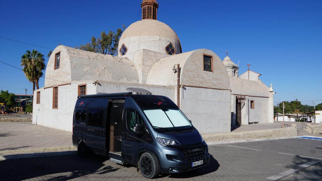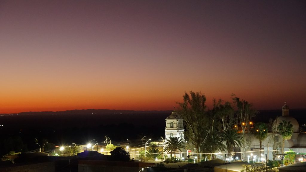 Mein Favorit zum Ausklang des Tages war ein Aussichtspunkt außerhalb von Pica, mitten im Nichts mit Blick auf Pica. Theres hatte andere Vorstellungen, Sand gehörte nicht dazu. So stehen wir jetzt in dem Wüstenort Matilla vor der Kirche. Es ist jetzt 20:00 und der Ort erwacht so langsam zum Leben. Es gibt einen kleinen Aussichtsturm, von dem wir den Sonnenuntergang über der Wüste beobachten konnten. Und ganz wichtig, ein Platz ohne Sand.;-)