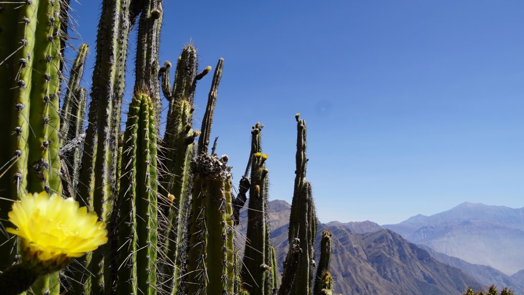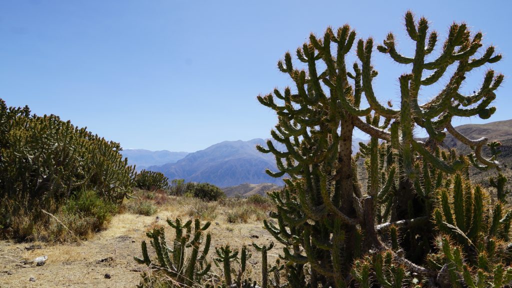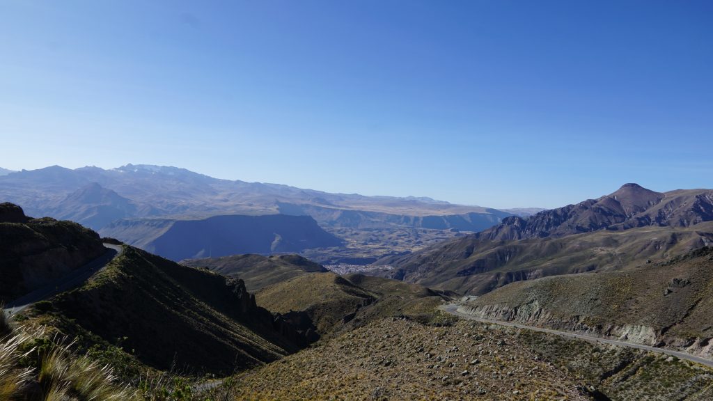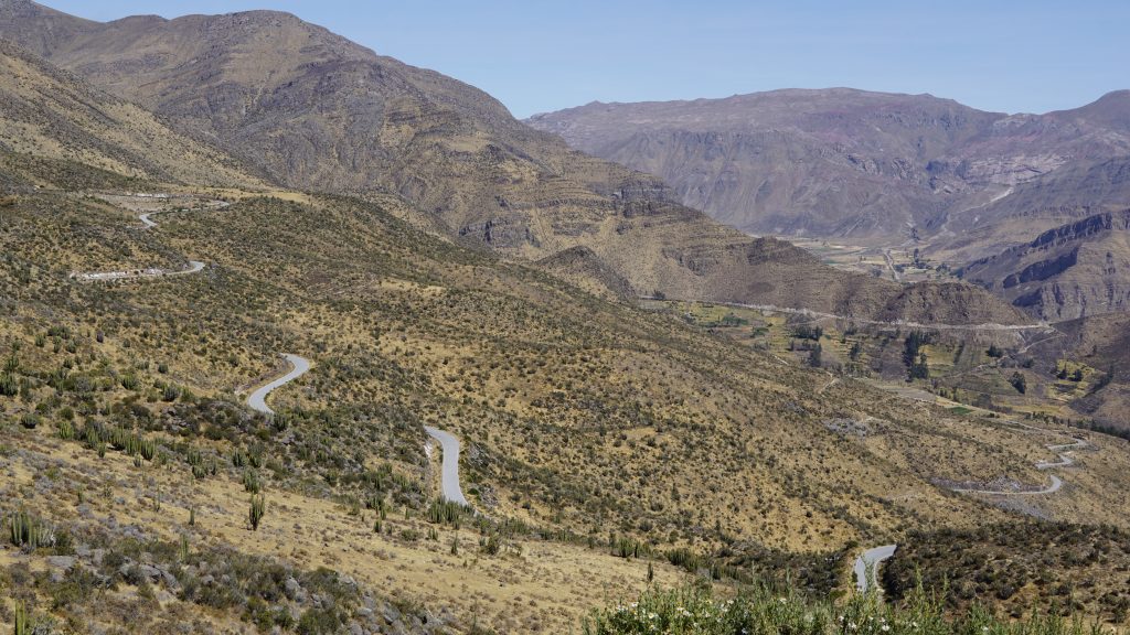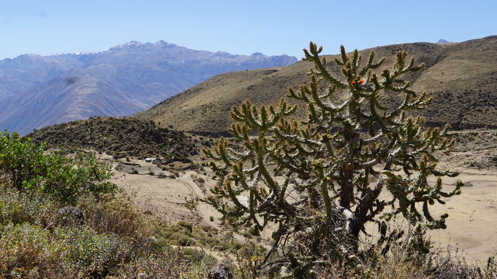 Wir wollten nicht wieder die gleiche Strecke über Areqiupa zurück und dann Richtung Norden. Also wählten wir den Weg weiter über Huambo nach Tambillo. Mit jedem Kilometer stieg die Hoffnung, dass der Weg weiter asphaltiert bleibt. Bis Huambo war es auch so, dann begann der Schotter! Es war eine tolle Strecke mit wunderschönen Blicken, auf bestellte Felder, blühende Kakteen, in den Canyon hinein und auf die Vulkane.