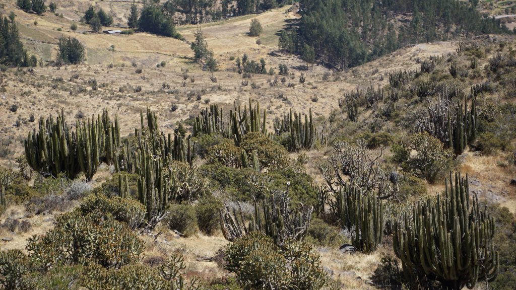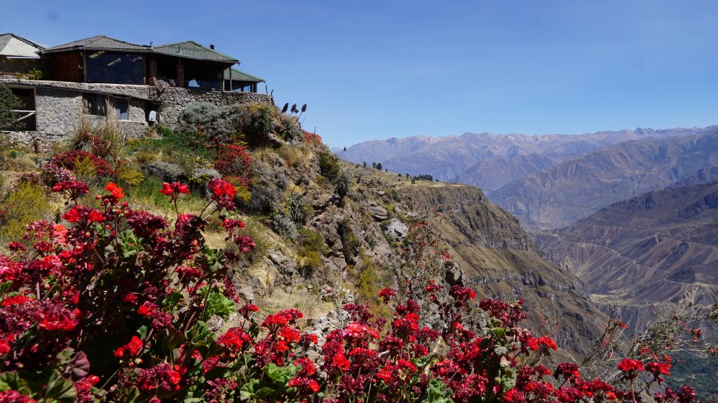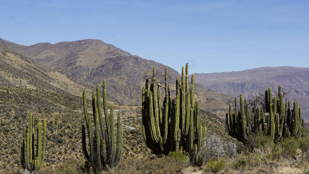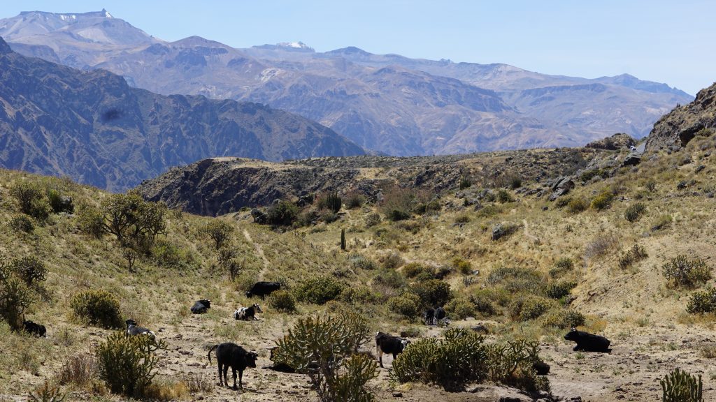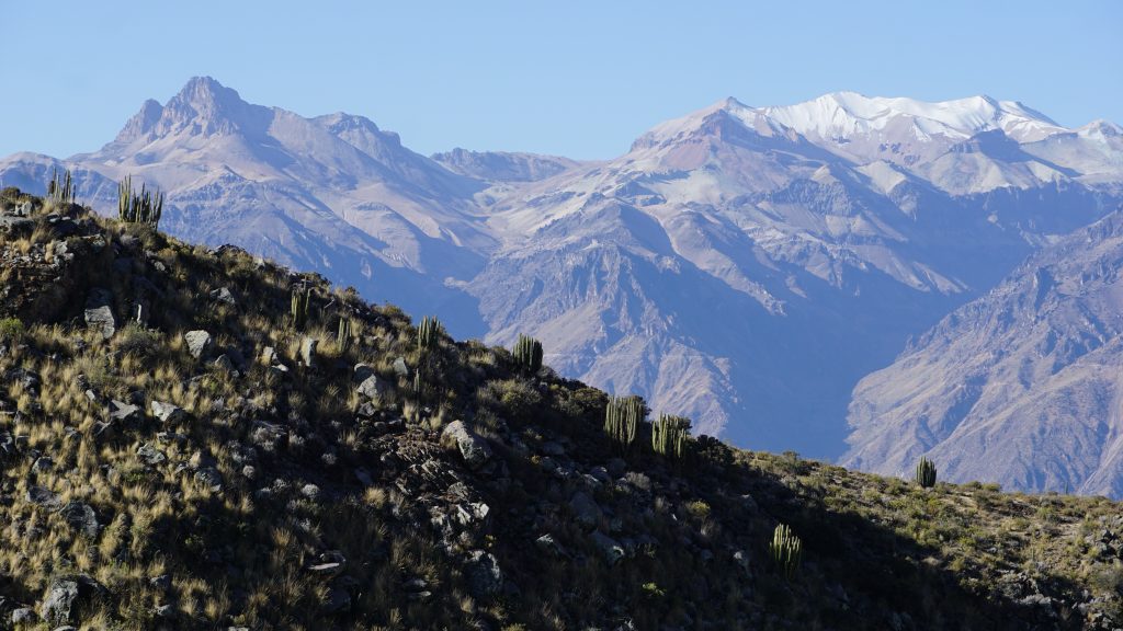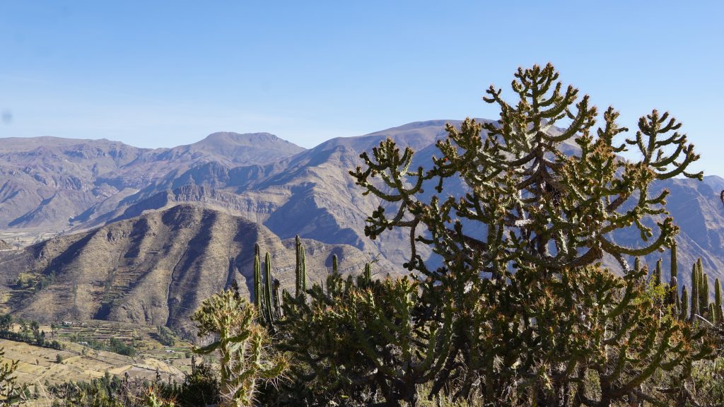 Wir wollten nicht wieder die gleiche Strecke über Areqiupa zurück und dann Richtung Norden. Also wählten wir den Weg weiter über Huambo nach Tambillo. Mit jedem Kilometer stieg die Hoffnung, dass der Weg weiter asphaltiert bleibt. Bis Huambo war es auch so, dann begann der Schotter! Es war eine tolle Strecke mit wunderschönen Blicken, auf bestellte Felder, blühende Kakteen, in den Canyon hinein und auf die Vulkane.