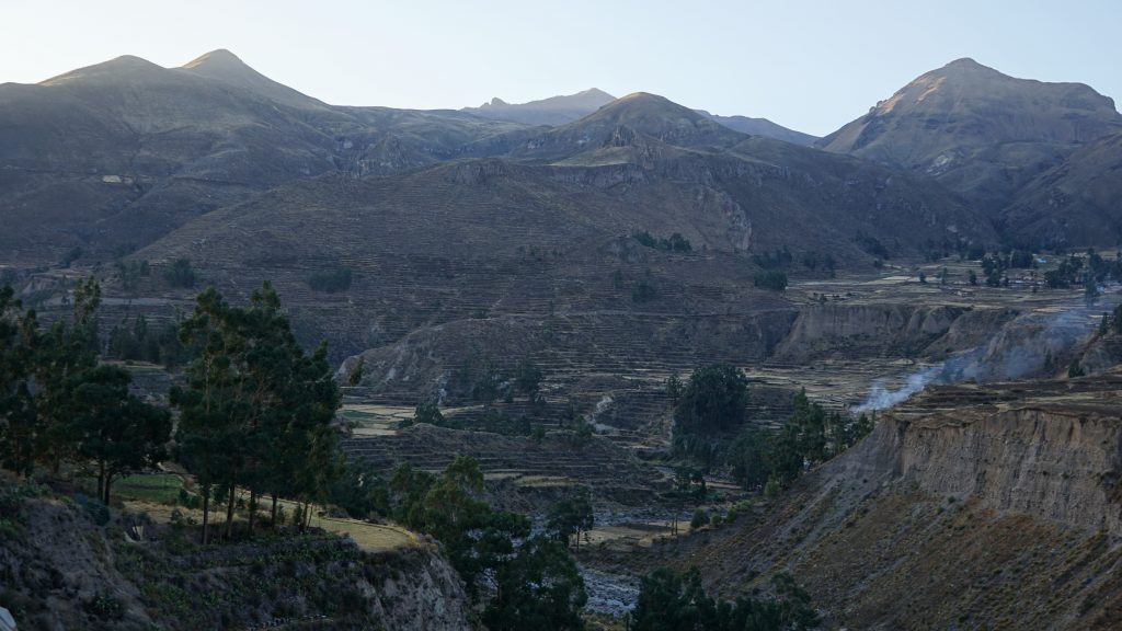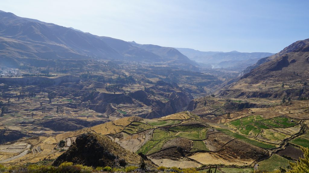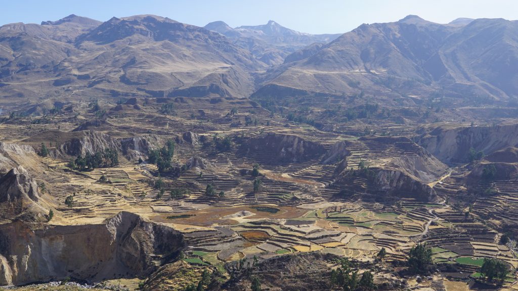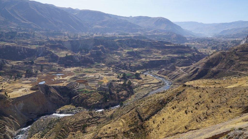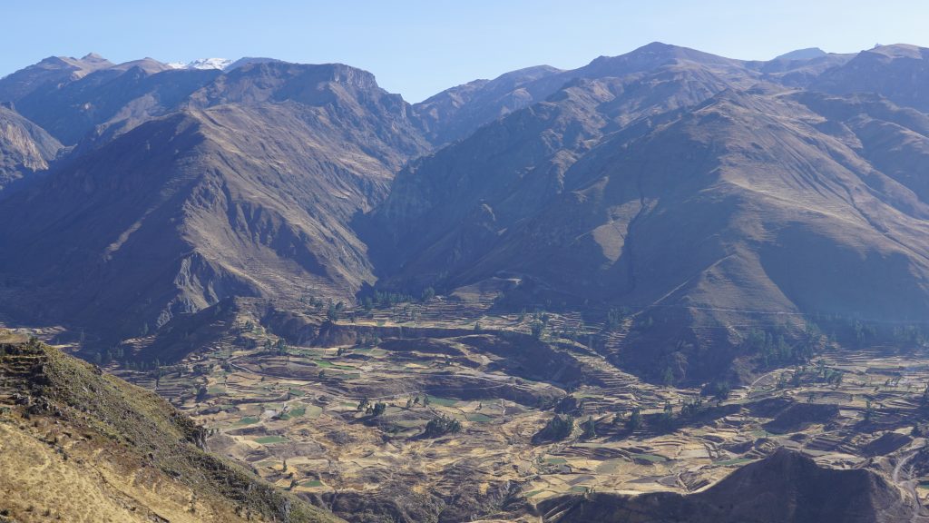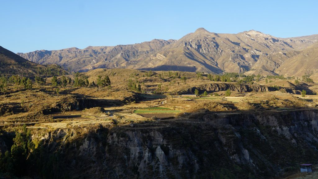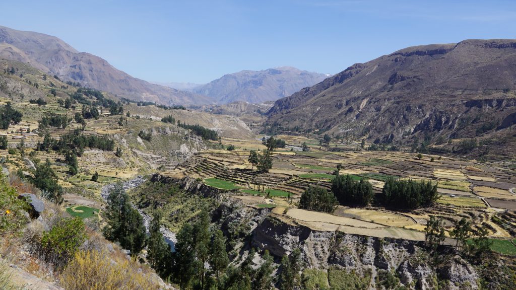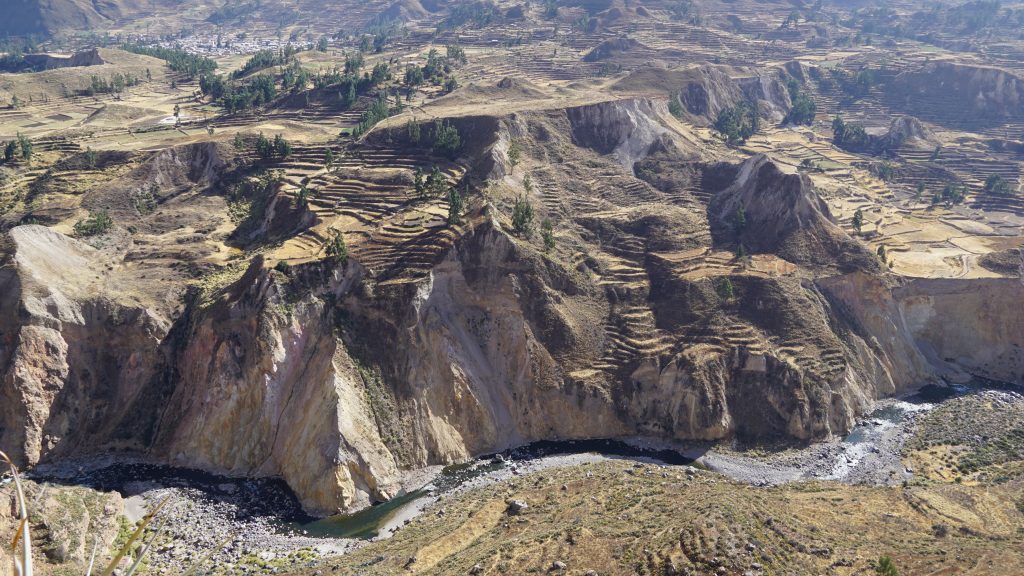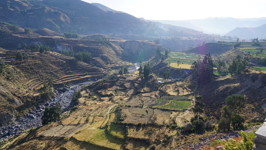 In den Canyon del Colca fährt man hinein, an bestellten Terrassenfeldern vorbei, bis dann vor dem Viewpoint die Felsen steil abfallen. Der Canyon ist permanent präsent.