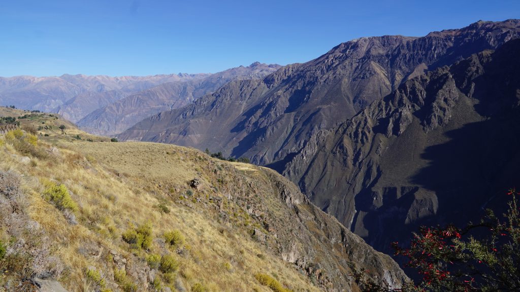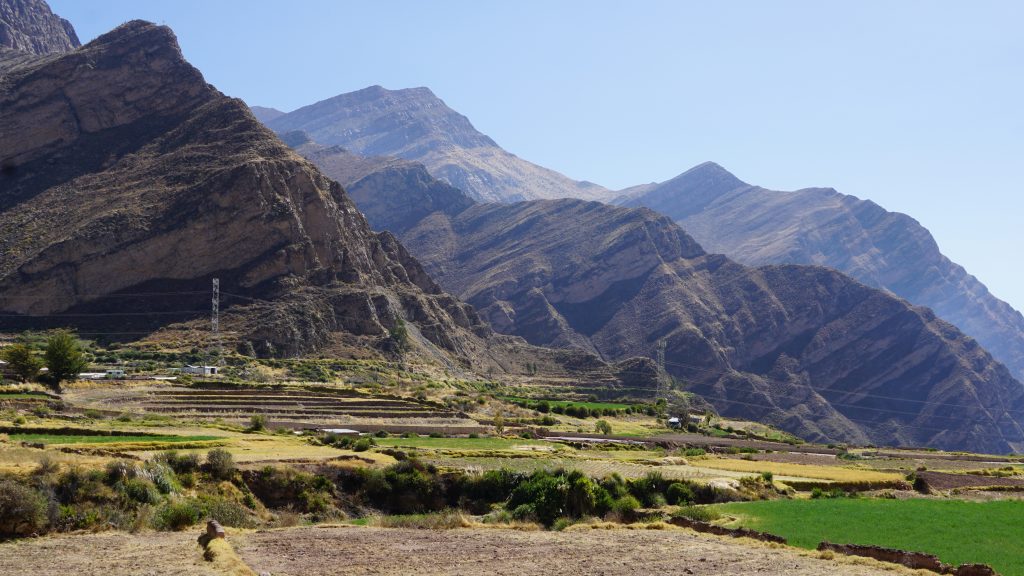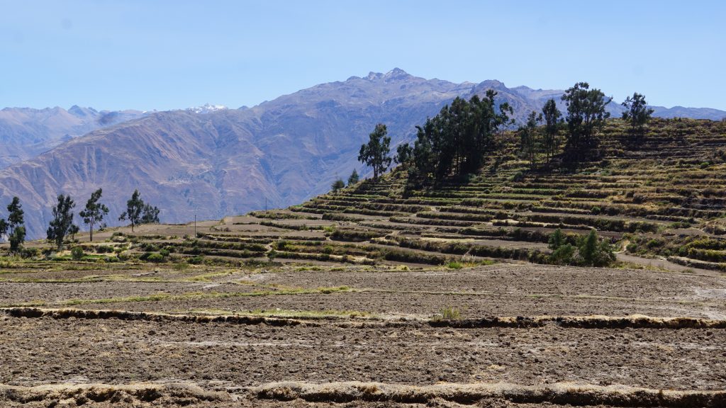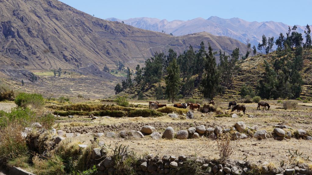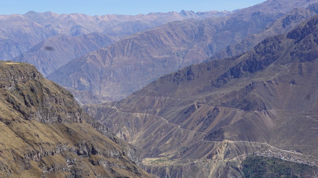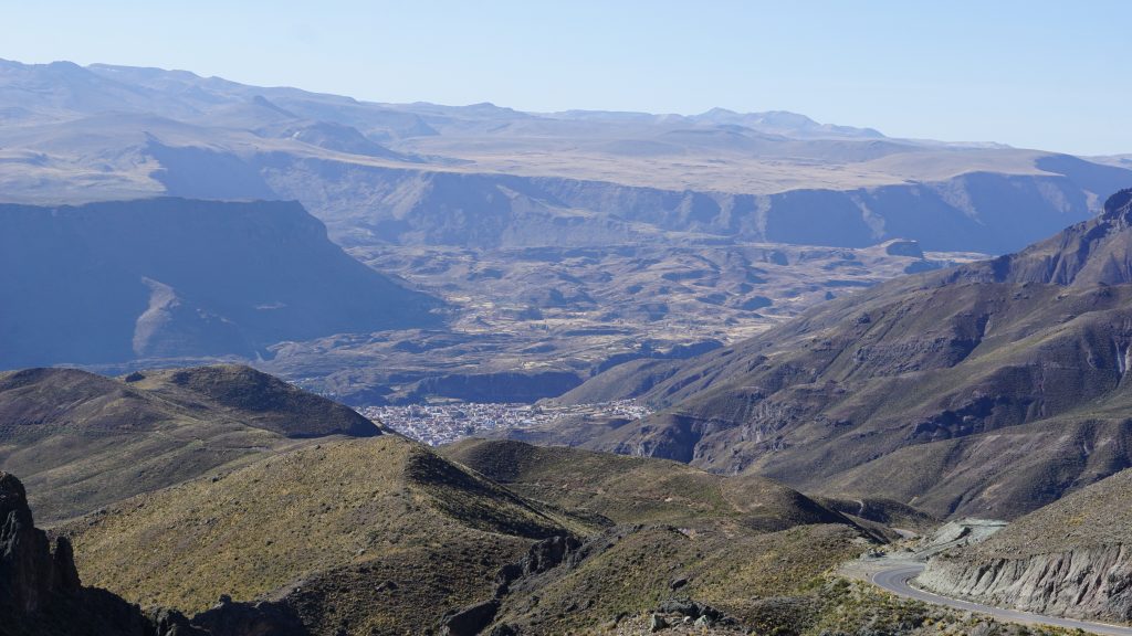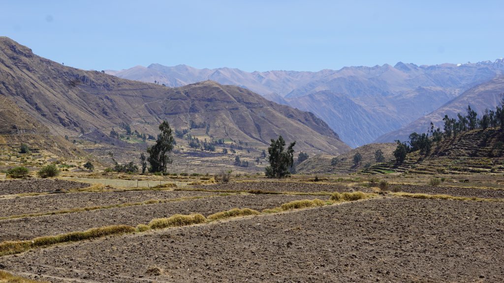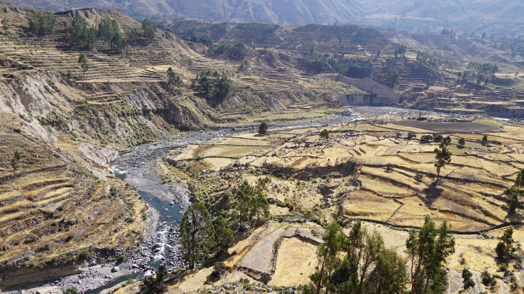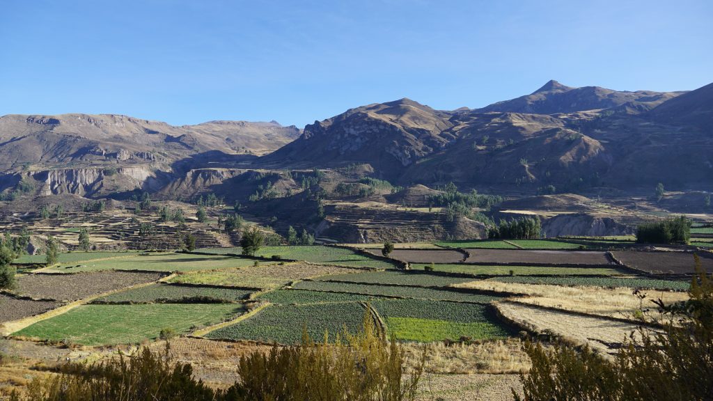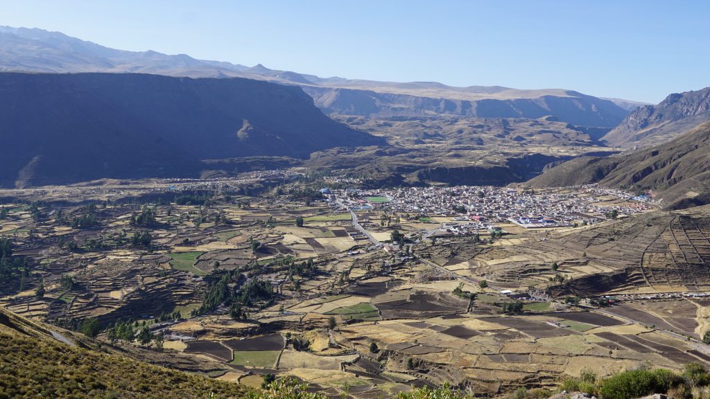 In den Canyon del Colca fährt man hinein, an bestellten Terrassenfeldern vorbei, bis dann vor dem Viewpoint die Felsen steil abfallen. Der Canyon ist permanent präsent.