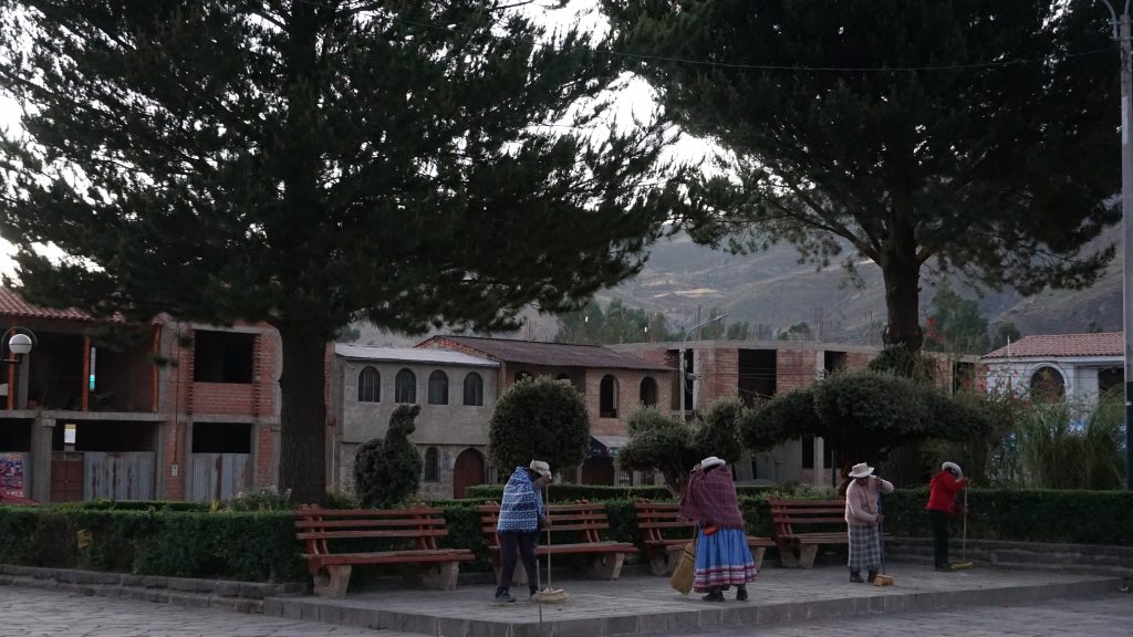 irgendwo in der Nähe von Yanque ist die Welt nicht stehen geblieben. Über das Tal (Canyon del Colca) schallte Diskomusik. Wir hatten keine Ahnung, wo die herkam, störte auch nicht. Natürlich ist die Welt hier nicht stehen geblieben. Der Tourismus weckt die Dörfer regelmäßig aus ihrem Winterschlaf. Und das nicht erst gegen Mittag. Wir waren total überrascht, gegen 06:00 standen auf der Plaza die Einwohner mit ihren Ständen, bereit für die Touristen.