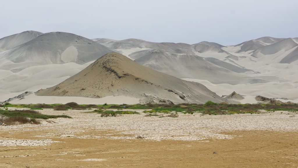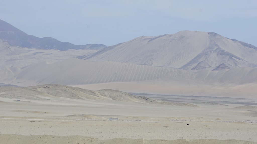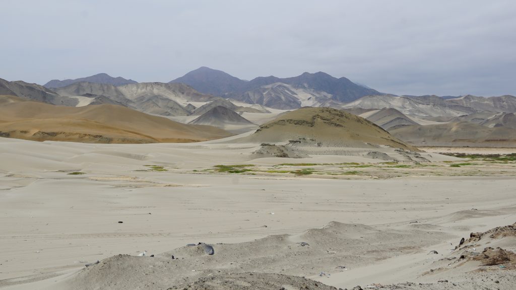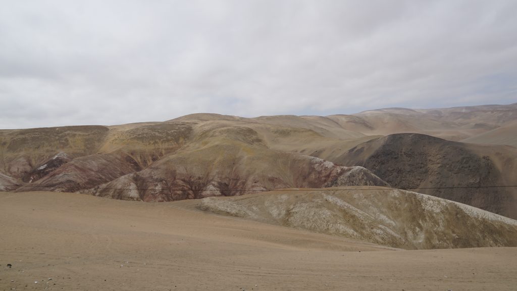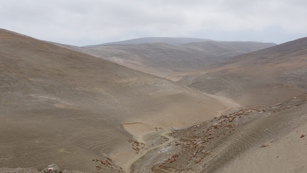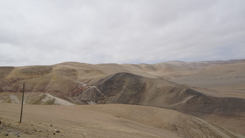 Es ging heute natürlich auch wieder entlang des Pazifiks und der angrenzenden Wüste. Beigetöne ohne Ende und zwischendurch überraschenderweise Hügel, die grün überzogen waren. Das Grün passte aber nicht so richtig zu dem leicht rötlichen Untergrund. Es sah irgendwie unnatürlich aus, handelte sich aber tatsächlich um Grünpflanzen.