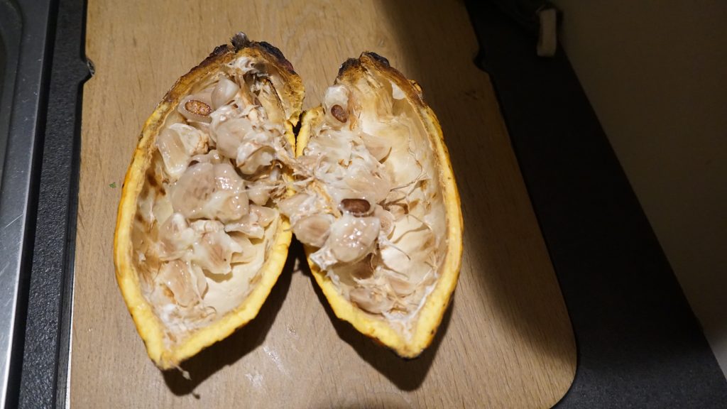 Nachtrag 2 Theres: heute zum ersten Mal eine Kakaofrucht gegessen.