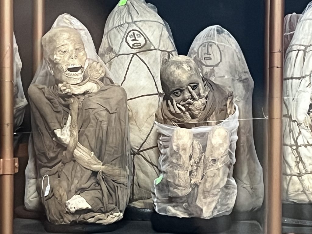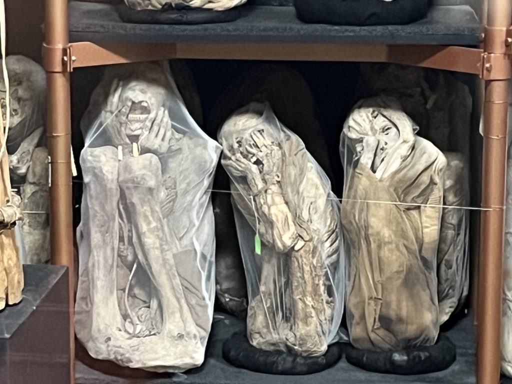 Bilder: Stadtverkehr in Lima, Nachtrag Mumien aus dem Museum Leymebamba, fertige Fischgerichte, unser Stellplatz in Paracas