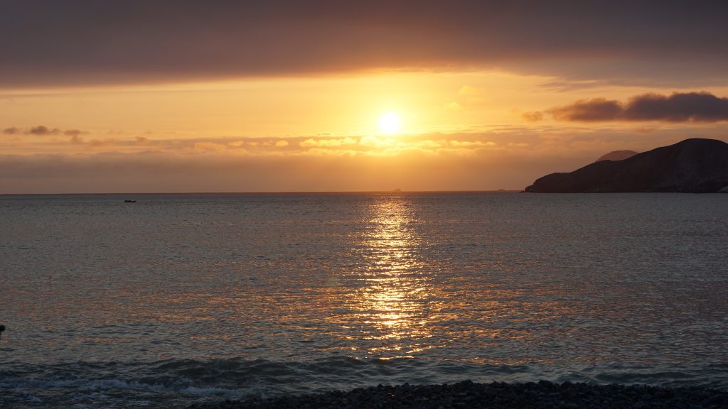 Wir sind noch ein gutes Stück voran gekommen. Grün ist jetzt wieder eine Seltenheit, denn wir fahren ja wieder durch die Küstenwüste. An der 1N wollten wir nicht übernachte. Also haben wir uns wieder einen kleinen Ort an der Küste gesucht. Hier stehen wir wieder am Strand, dieses mal sogar vor dem Sonnenuntergang. Ob wir morgen früh baden gehen wird sich zeigen. Es ist sehr steinig und das schmerzt an den Füßen, wenn die Wellen die Steine an den Strand tragen.