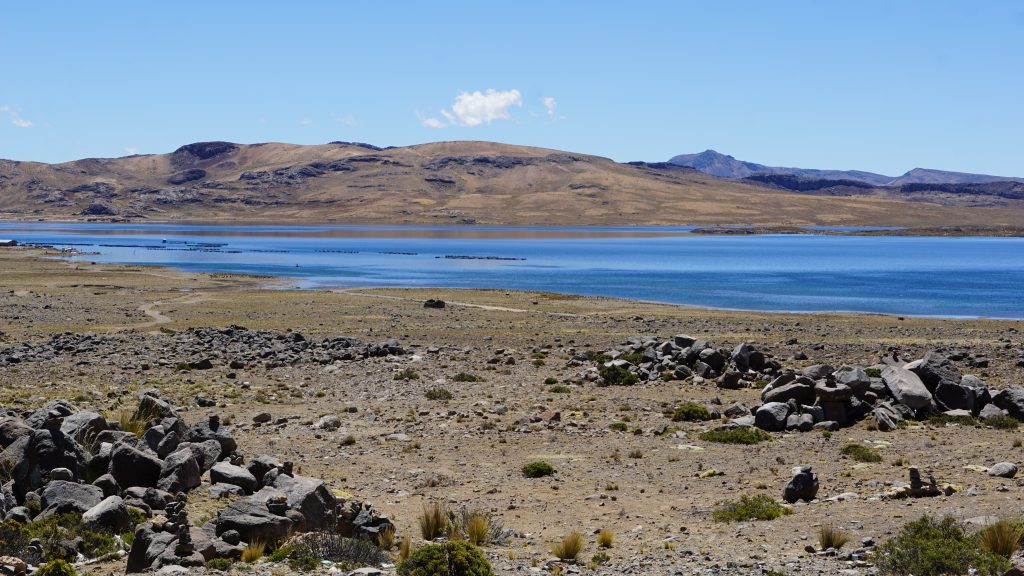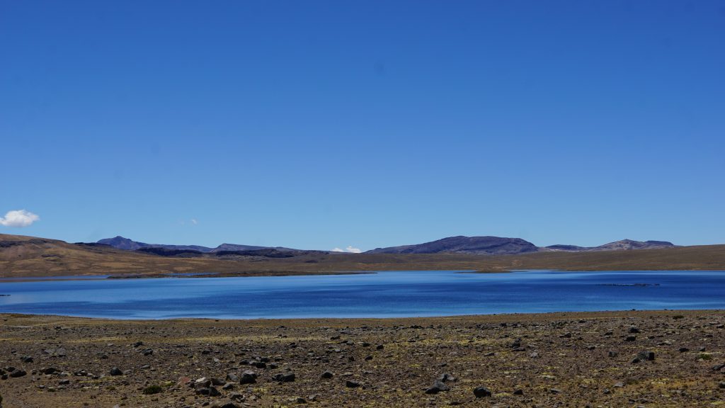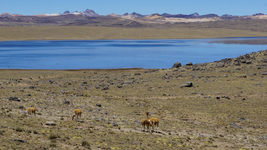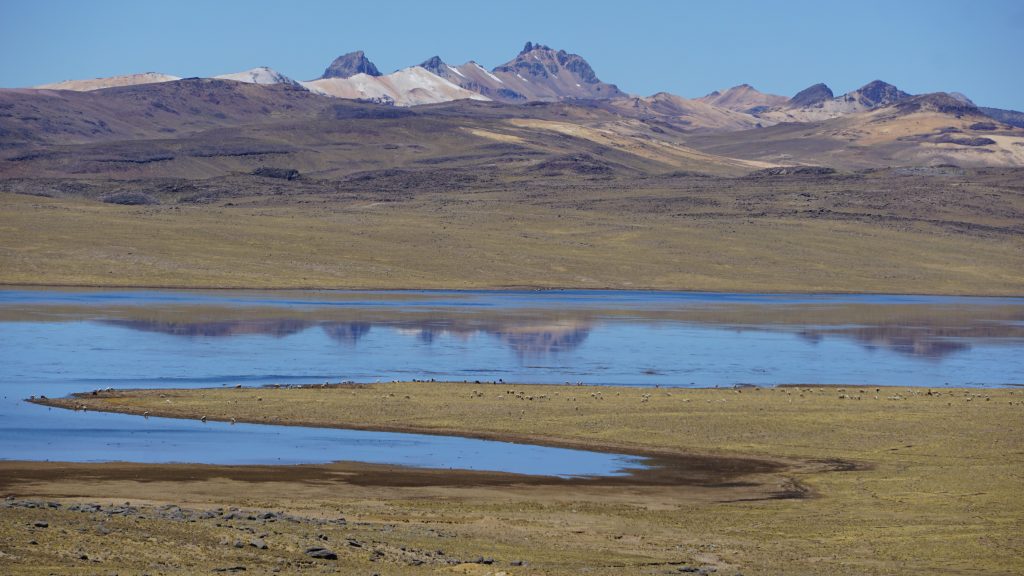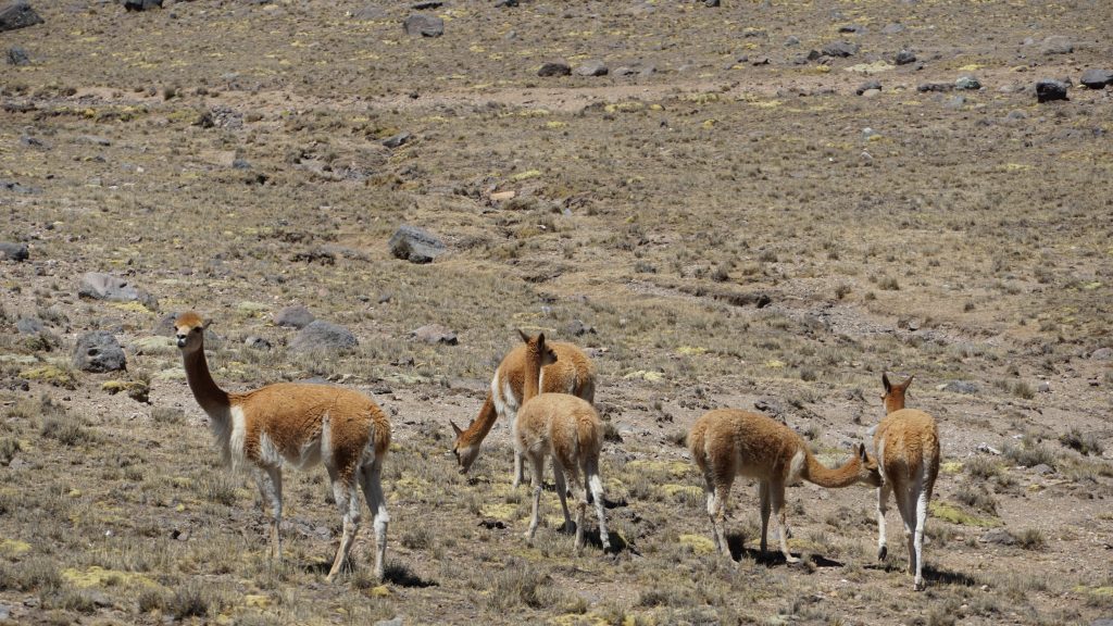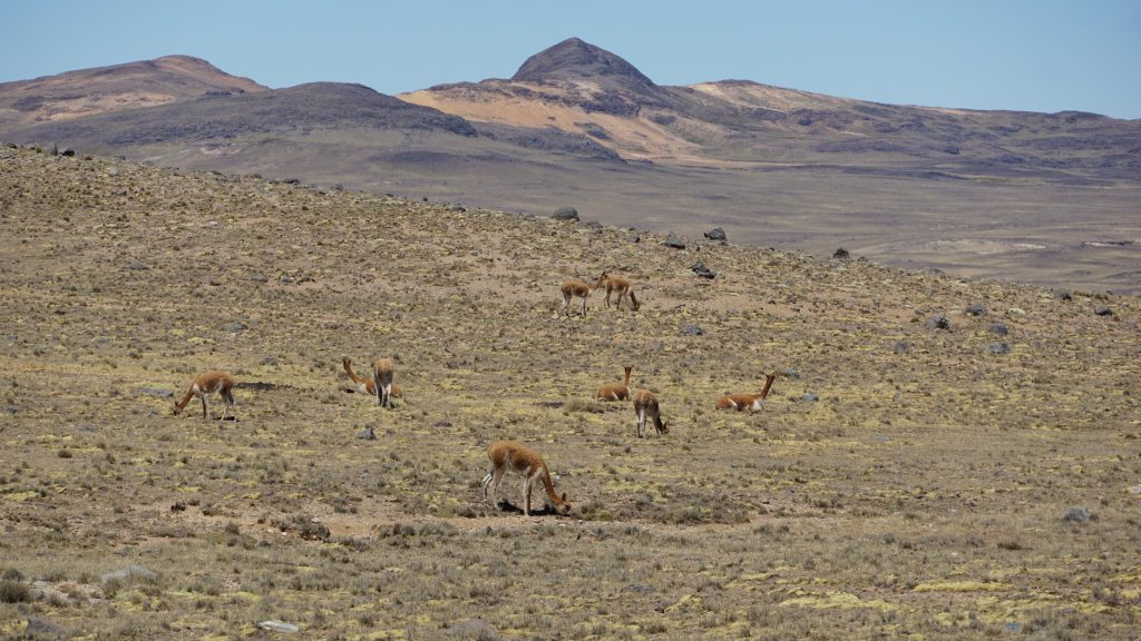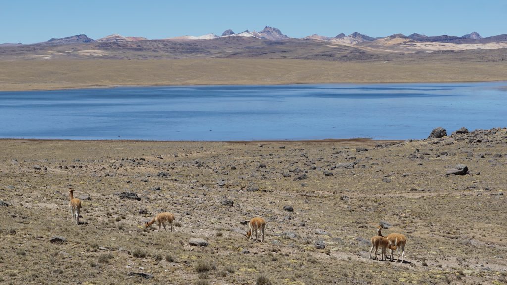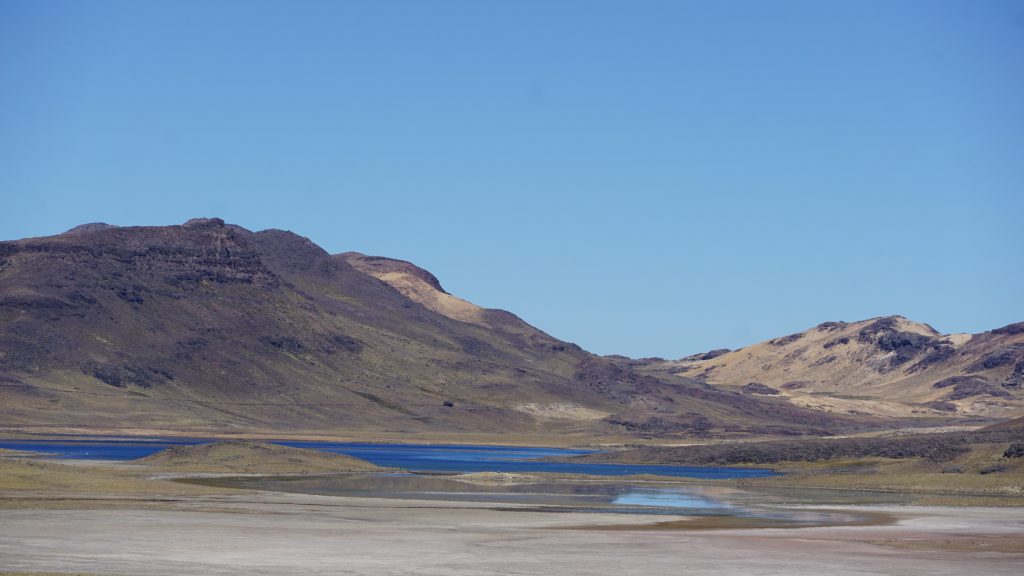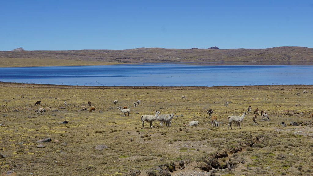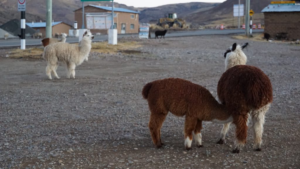 Es war eine tolle Strecke. Wir hatten das Gefühl, dass extra für uns eine Straße durch die Hochalpen gebaut wurde. Landschaftlich entsprach sie zumindest diesen, mit dem Unterschied, dass hier auch auf 3500hm noch die Bäume wachsen. Von unserem Startpunkt aus ging es erst einmal wieder bergauf. In der Straßenkarte steht der Pass bei 4300. Unser Navi am Handy und im Auto endete bei 4580hm. Anschließend ging es über 100km auf 4500hm entlang, an dunkelblauen Lagunen vorbei. Heute waren auch wieder unzählige Vicunas, Alpacas und Lamas zu sehen und sogar Flamingos standen an den Lagunen.