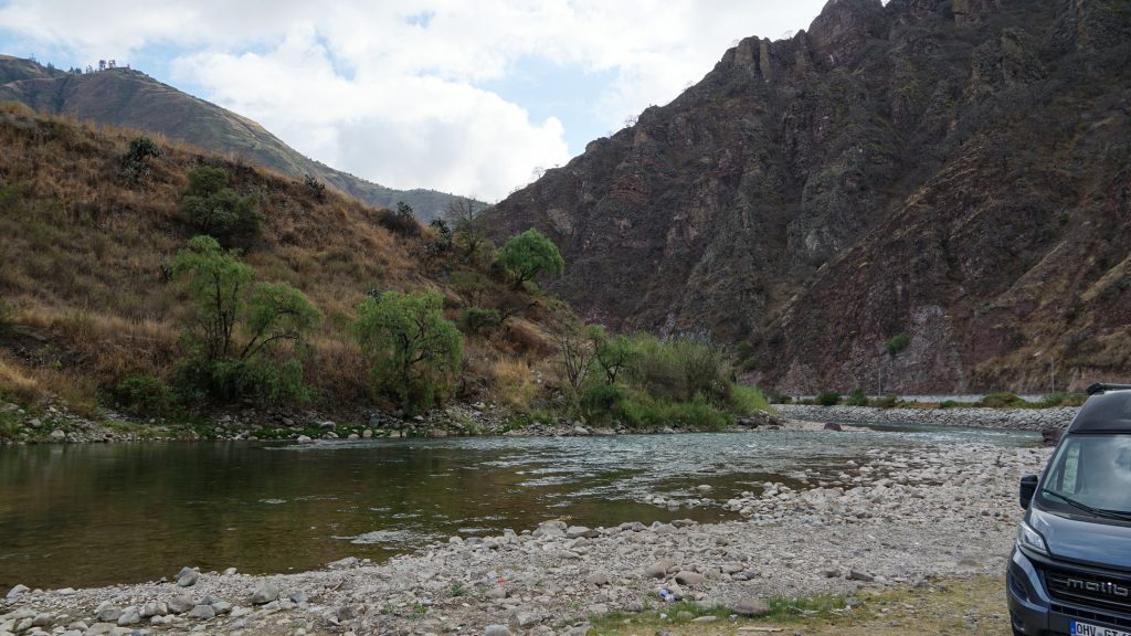Nach einer gefühlten Ewigkeit führte unsere Straße wieder abwärts auf angenehme Höhen (2400hm), immer am Rio Huanca entlang und die Temperaturen stiegen wieder. Wir sind gut voran gekommen, es fehlte nur noch ein Plätzchen am Rio. Plötzlich vor uns auf der Straße eine handtellergroße schwarze Spinne. Wir sind beide der Meinung, dass es eine Vogelspinne war. Ich konnte gerade noch ausweichen.