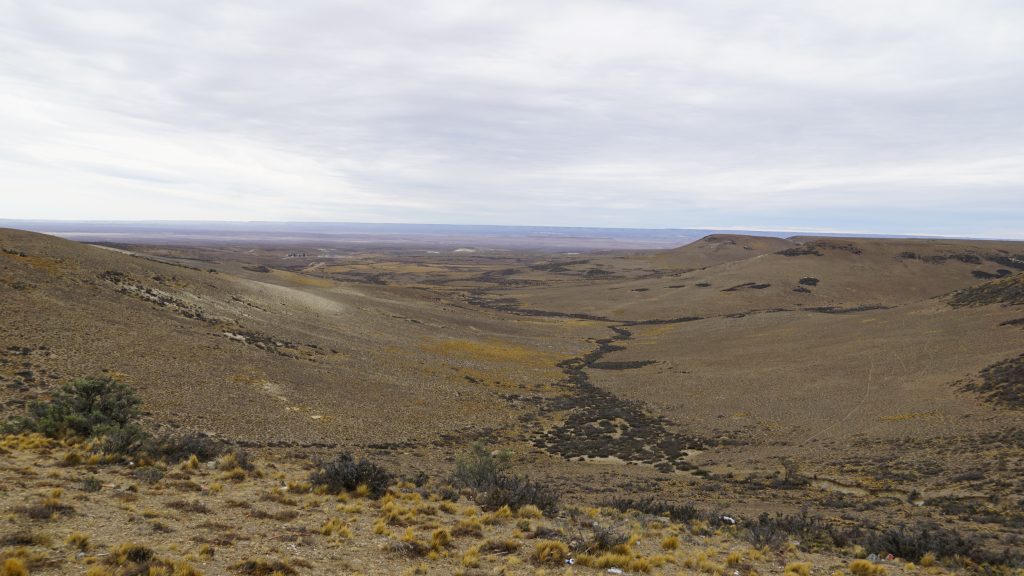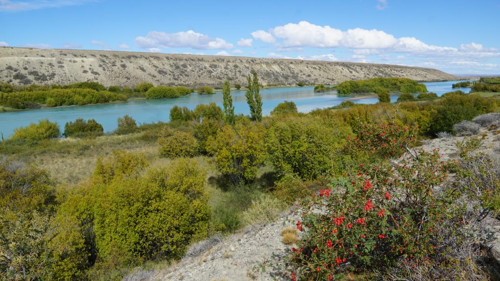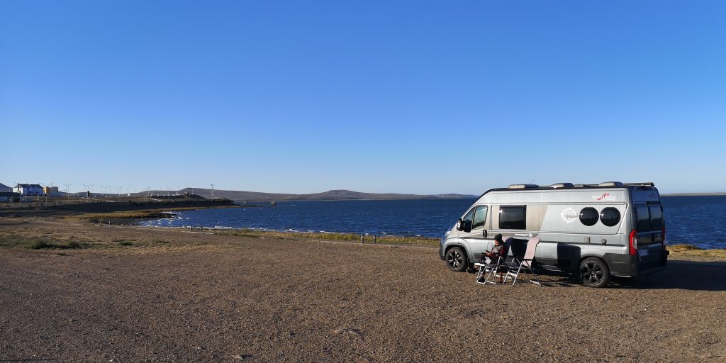ein kleiner Nachtrag von gestern auf unserem Stellplatz. Wir standen gemütlich allein und nutzten die letzten Sonnenstrahlen, als ein argentinisches Wohnmobil sich zu uns gesellte. Eine Frau (so etwa unser alter) stieg aus und fragte uns, ob es hier sicher sei, zu stehen. Wir waren schon etwas sprachlos über diese Frage. Wenn, so hätten wir das doch eher umgekehrt verstanden, wenn wir gefragt hätten. So spielt das Leben. Die 400 km bis nach Rio Gallegos waren geprägt durch starken Seiten- und Gegenwind. Der Verbrauch stieg dementsprechend sicher auf 12l. Landschaftlich veränderte sich das Bild permanent. Lange gerade Strecken wechselten sich mit kurvenreichem, leicht bergigem Gelände ab. Dann auf einmal wie eine Oase alles grün am Rio Santa Cruz.