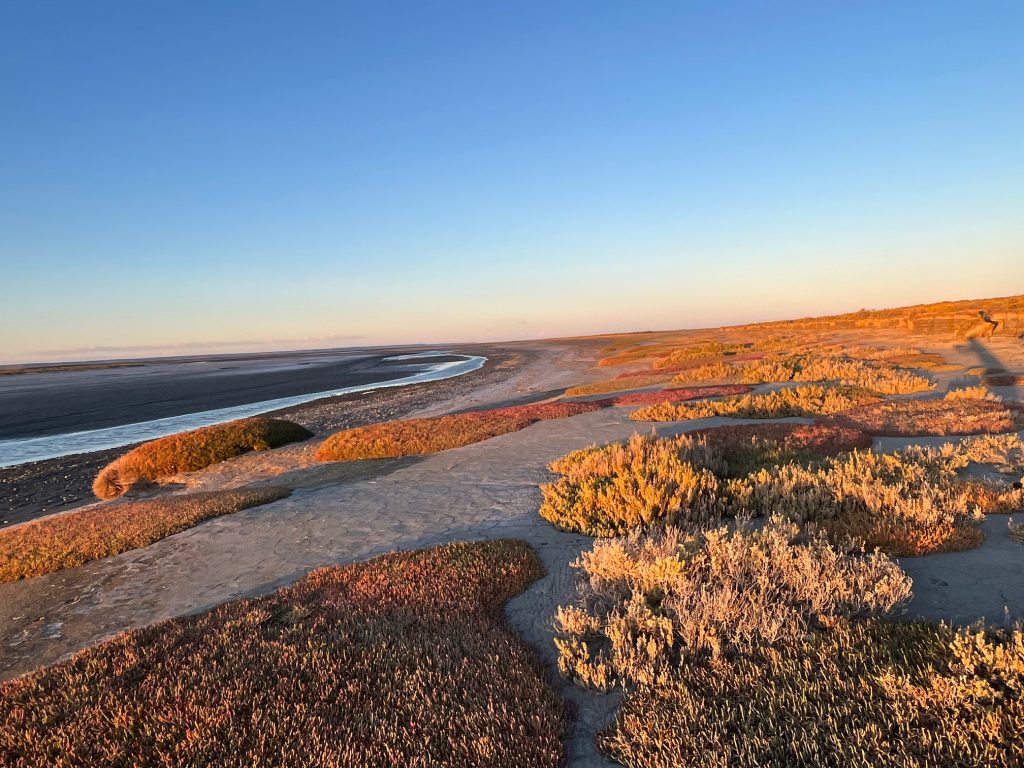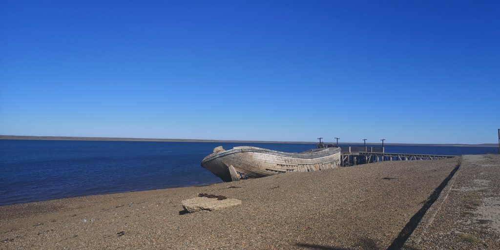Zwei Dinge, die ich gelesen habe, aber mir nicht richtig vorstellen konnte: Fast vor jeder Einfahrt in eine Stadt gibt es Polizeikontrollen mit einer Passkontrolle. Also wer uns vermisst, fragt einfach bei der Argentinischen Polizei nach, die wissen zu 80%, wo wir uns aufhalten. Dann der permanente Müll, der hauptsächlich um die Ortschaften, an den Straßenrändern liegt. In der Hauptsache Plastikverpackungen. Heute stehen wir am Flußdelta des Rio Deseado, natürlich allein und bei fast keinem Wind. Haben uns aber für morgen entschieden, einen Tag auf den Campingplatz der Stadt zu gehen und alle Fünfe gerade sein zu lassen.