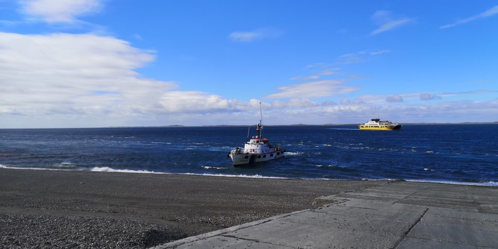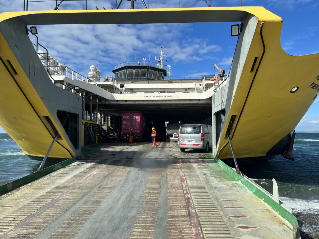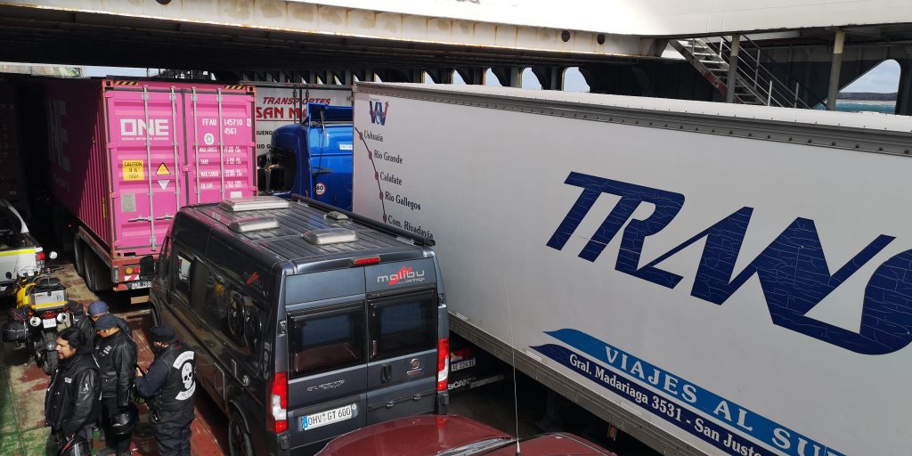 60 km später standen wir an der Magallanstraße und warteten auf die Fähre, die jede Stunde fährt. Wir waren überrascht, wie viele Fahrzeuge (LKW und PKW) auf das Schiff passten. Also sogar diese Wartezeit hielt sich in Grenzen, denn mit dem ankommenden Schiff wurden wir gleichzeitig für 24€ auf die Insel übergesetzt.