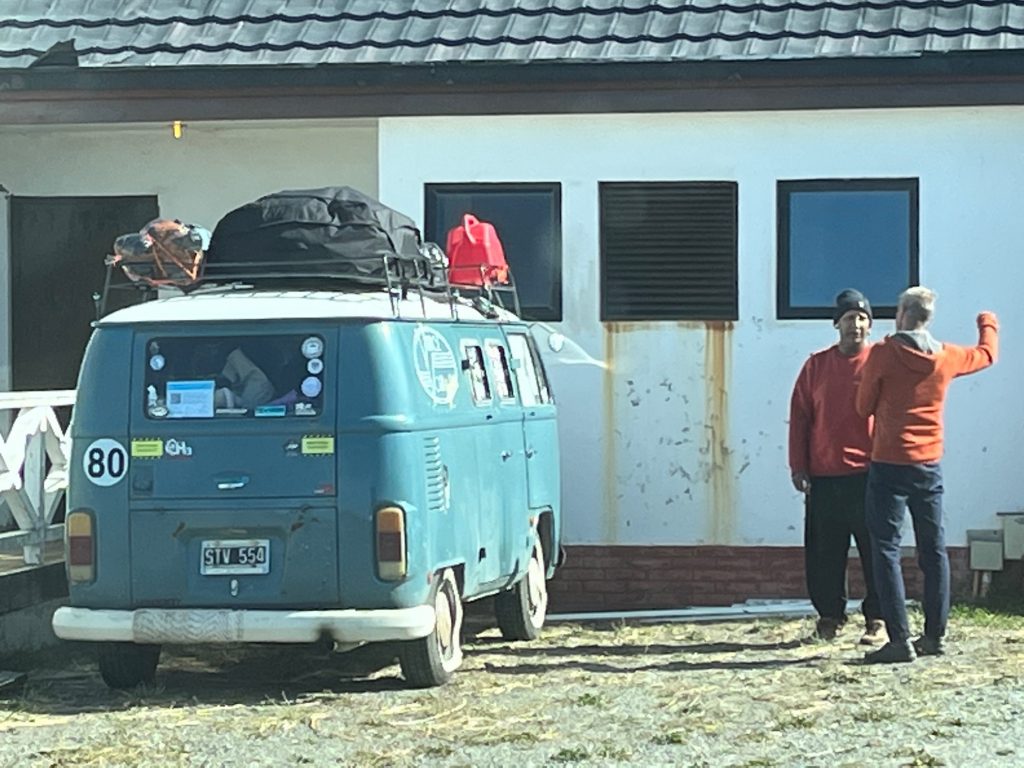 was für ein spannender Tag, wir sind noch nicht in Ushuaia, auch wenn wir das entspannt geschafft hätten. Aber wie so oft kommt es anders, als man denkt. Wir hatten eine wunderbare ruhige Nacht, die Pinguine haben wir uns nicht angeschaut, da wir nicht bis um 11:00 warten wollten. Kaum waren wir wieder auf der Hauptstraße (zu unserem Stellplatz waren es ca. 30 km Schotterpiste), standen 2 Tramper an der Straße. Monika aus Neuseeland und Mister X (Namen haben wir vergessen) aus Santiago de Chile. Sie wollten nach Ushuaia, aber es fuhr kein Bus, erst wieder von Rio Grande aus. Für uns persönlich zwar unverständlich so unvorbereitet los zu fahren, aber so hatten wir für ca. 150 km eine internationale Gemeinschaft (Zwischenzeitlich passierten wir die Grenze zwischen Chile und Argentinien mit den üblichen Stationen, Migration und Aduana). Es war ein interessanter Austausch über die Zeit und wir haben die Gelegenheit genutzt, auch Rio Grande noch kennen zu lernen. Ok, wer nicht dort war, hat auch nicht wirklich was verpasst. Wir schon, denn wir brauchten wieder Brot und Obst und Gemüse haben uns aber vorgenommen, nicht mehr in die Supermärkte zu gehen, sondern in die kleinen Läden in den Seitenstraßen. Theres ging zuerst in die Panaderia für Brot und kam gar nicht mehr weg, weil alle wissen wollten wo wir her kamen und hin wollten. Danach gingen wir gemeinsam in einen Obst-und Gemüseladen, die junge Verkäuferin amüsierte sich über mein Bärtchen und versuchte mir begreiflich zu machen, an wen ich sie erinnere. An Merlin den Zauberer hat sich dann herausgestellt. Als Theres wieder Maniokwurzeln einpackte, bekam sie fast einen Schreck, bis wir ihr erklärten, dass wir wissen worum es sich handelt. Es war einfach echt süß.