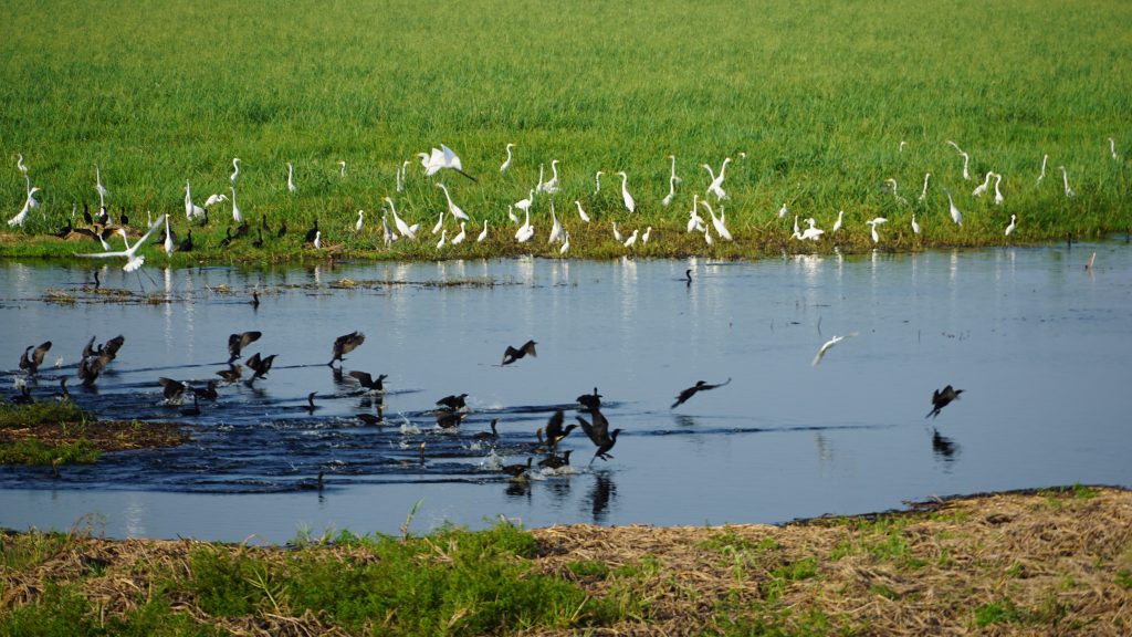 Vögel mit schwarzem Kopf und Hals und weißem Körper. So etwas haben wir definitiv noch nicht gesehen. Vielleicht ist ein Foto geworden, denn sie fühlten sich gestört und flogen davon.