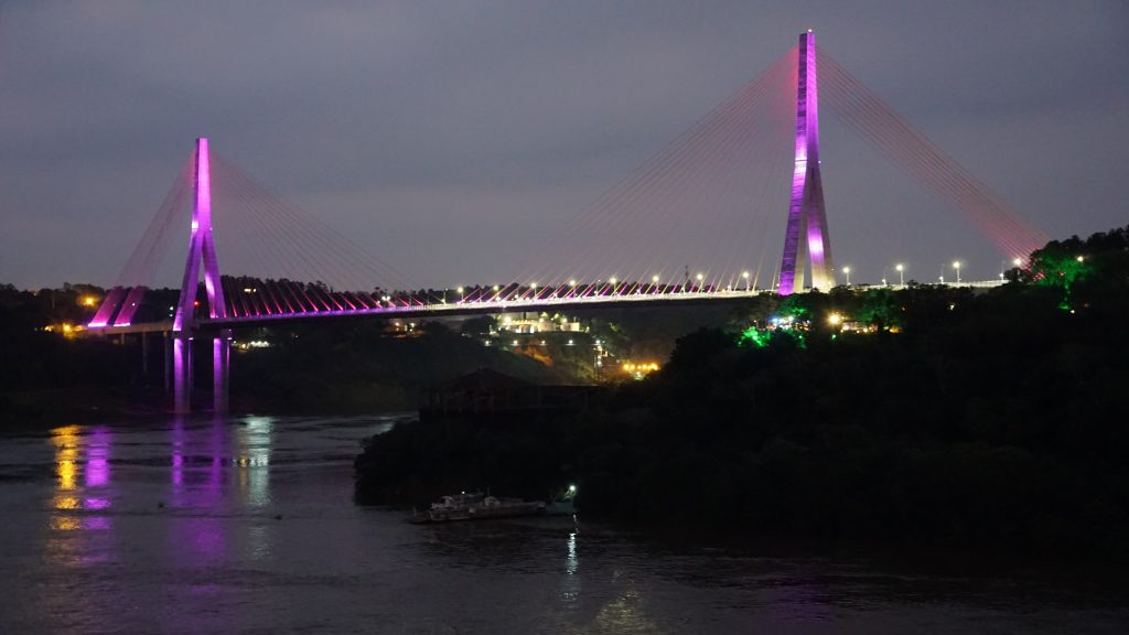 Hier stehen wir nun auch. Aus Brasilien schallt klassische Musik herüber und die Brücke von Brasilien nach Paraguay ist wunderschön beleuchtet. Wir selbst sitzen draußen und genießen dieses Ambiente.