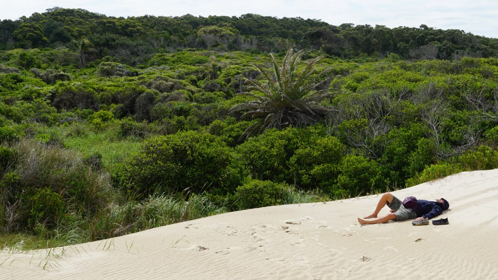 Heute war Strandwanderung angesagt, um die Haut zu schonen. Das Wetter bot sich dazu auch an. Ein breiter Strand mit hellem weisen Sand lag vor uns. In Richtung Land ging es in Dünenlandschaft über und dahinter dichter urwüchsiger Wald. Nun gibt es wieder ein paar mehr Muscheln zu verstauen und viele Meerfotos.