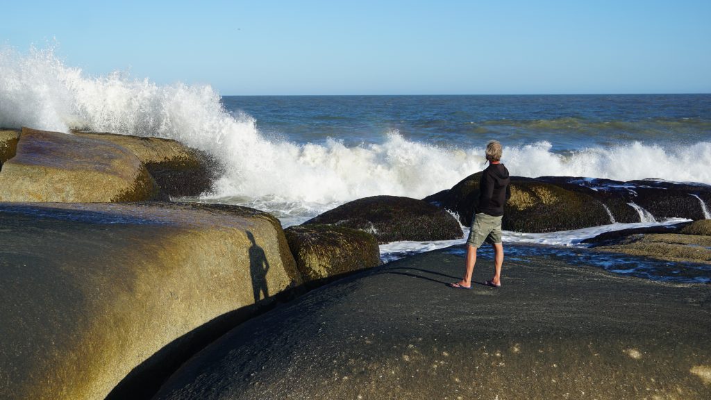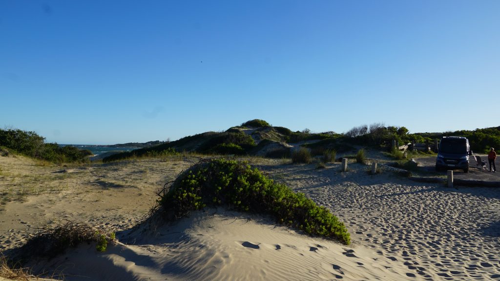 vielleicht war es wirklich gut, weiter oben zu stehen. Es war eine angenehm ruhige Nacht. Heute früh ging es natürlich gleich mit dem Camper wieder runter auf den Parkplatz am Meer. Es war „Whale watching“ angesagt. Zumindest sollen Wale zu dieser Jahreszeit hier vorbeikommen. Morgen vielleicht. Dafür standen wir den ganzen Tag allein am Strand, konnten auf die Wellen schauen und unseren Gedanken nachhängen. Und wir haben wirklich mal Zeit. Es steht nichts weiter auf dem Plan, als den Tag zu genießen.