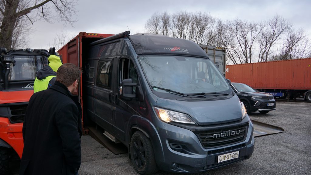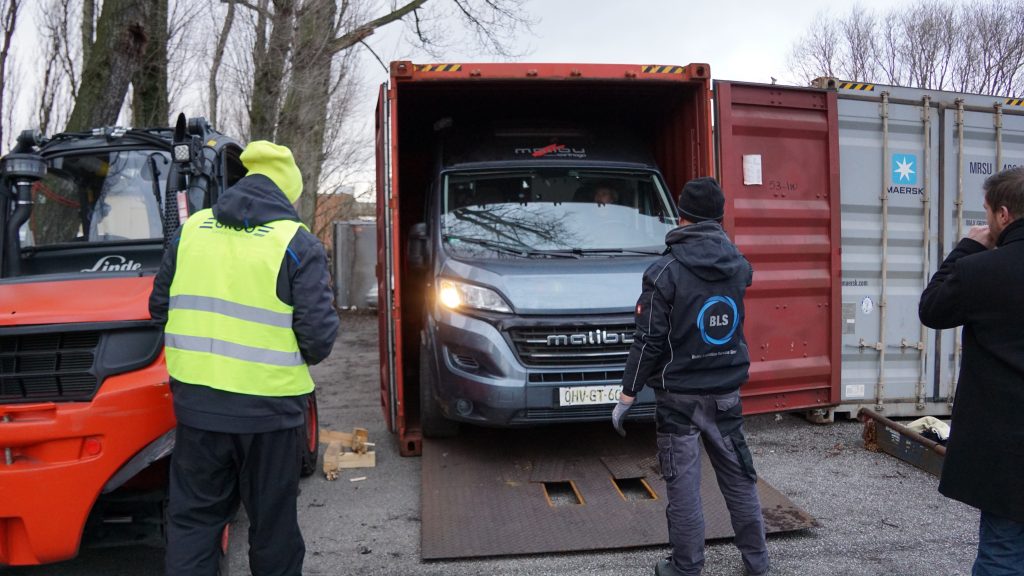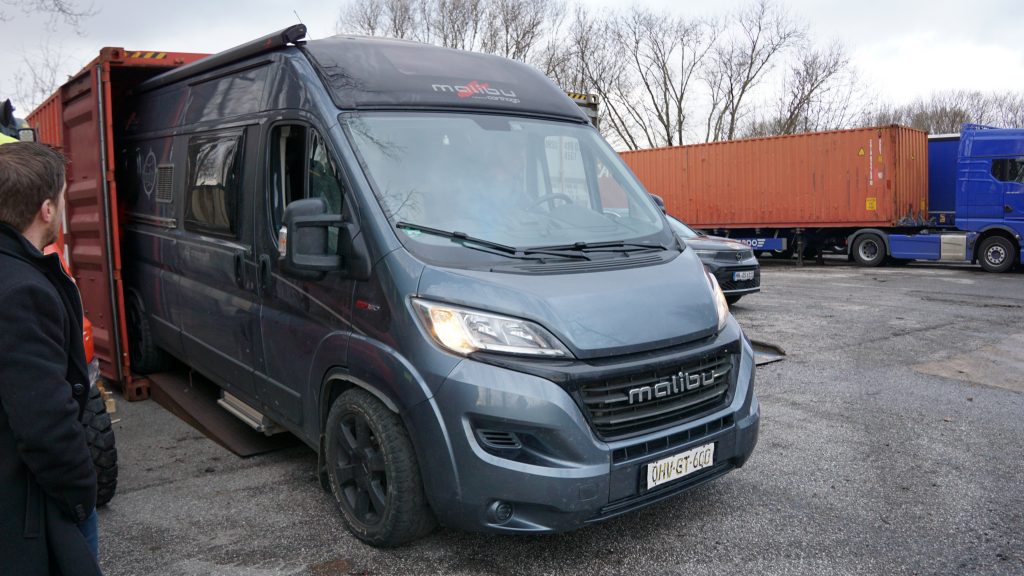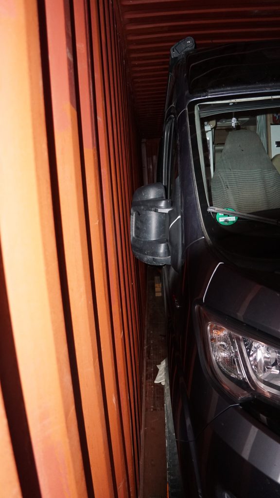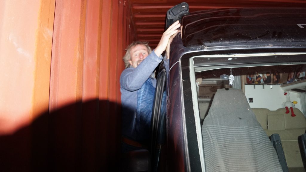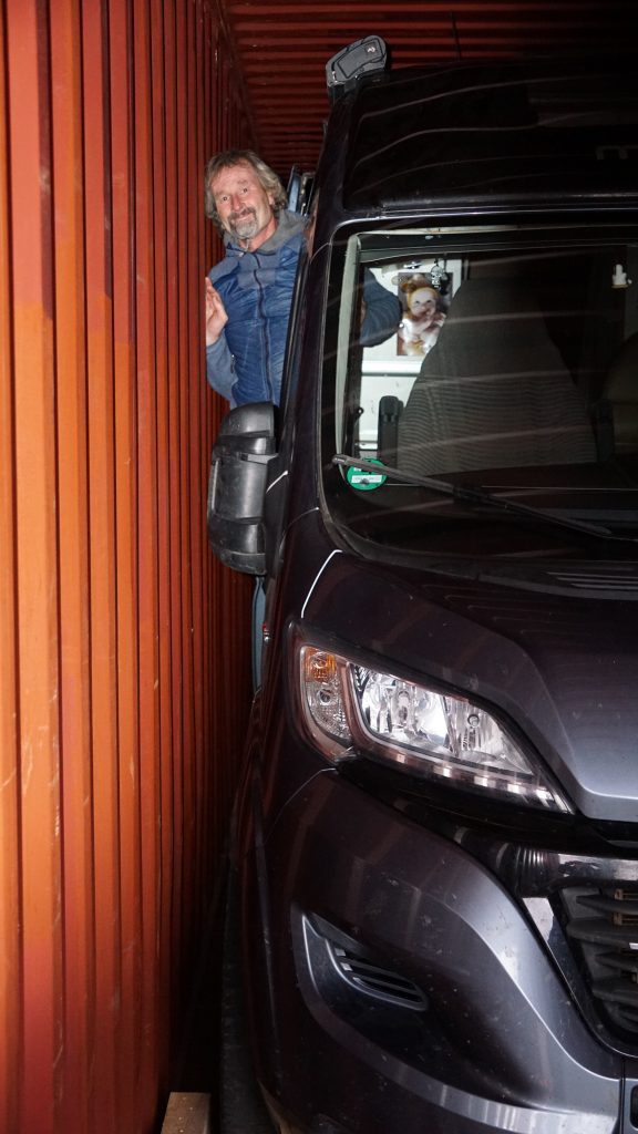 In Hamburg war vor Ort nicht so viel Personal (ein Mann) wie in Montevideo. Also habe ich mich freiwillig geopfert, um in den Camper zu gelangen. Es ging wieder über die Motorhaube und den Spiegel mit festhalten an der Markise und dann zwischen Camper und Containerwand Richtung Schiebetür nach unten rutschen. Das ging schneller und besser, als ich es in meinen Überlegungen erwartet hatte. Noch einmal durch den Camper und durch das Heck hinaus (der Türöffner war nicht so leicht zu finden), um die Spannbänder, mit denen die Räder fixiert waren, zu lösen.
