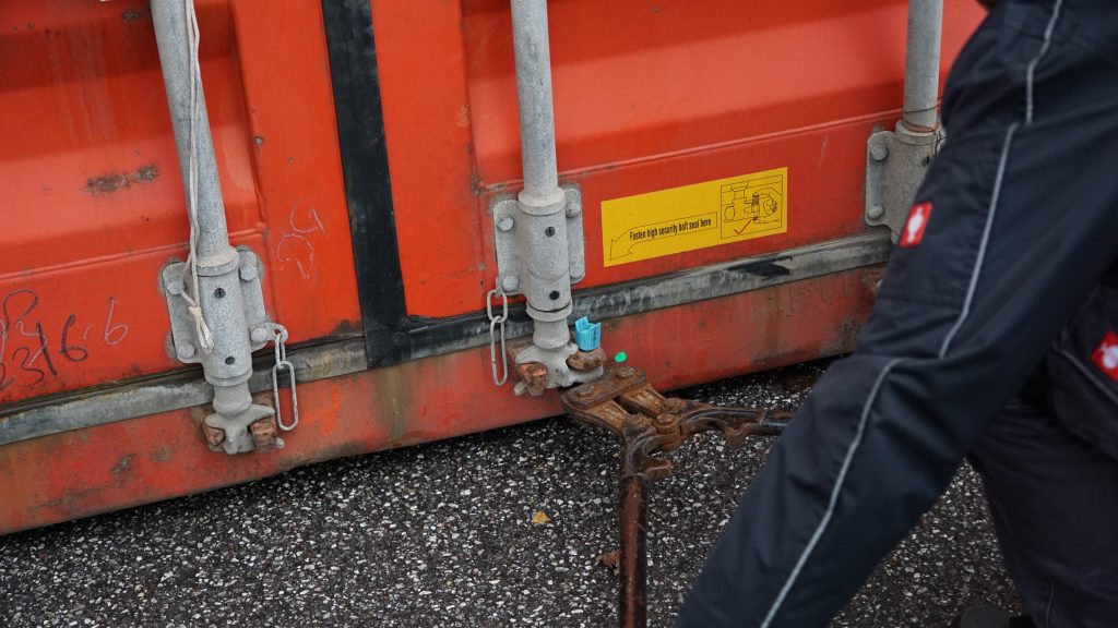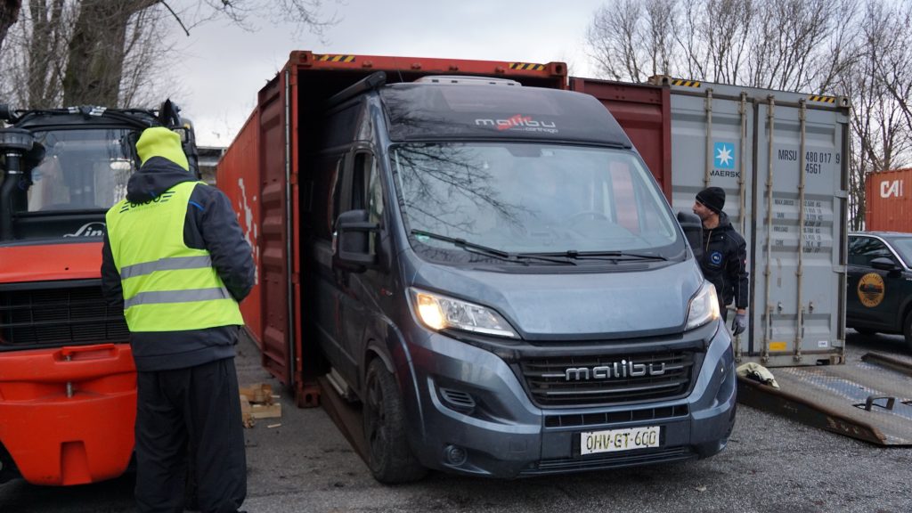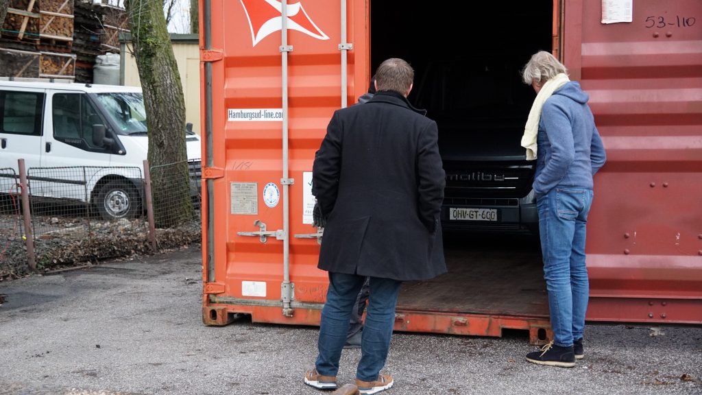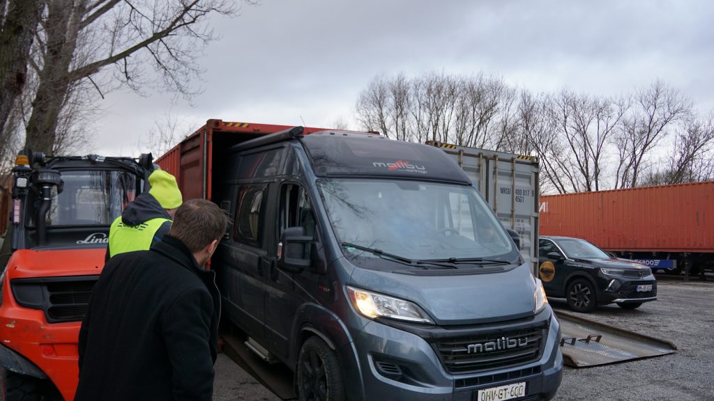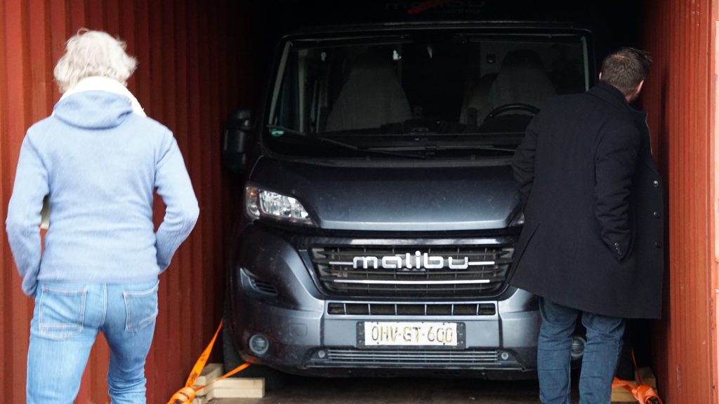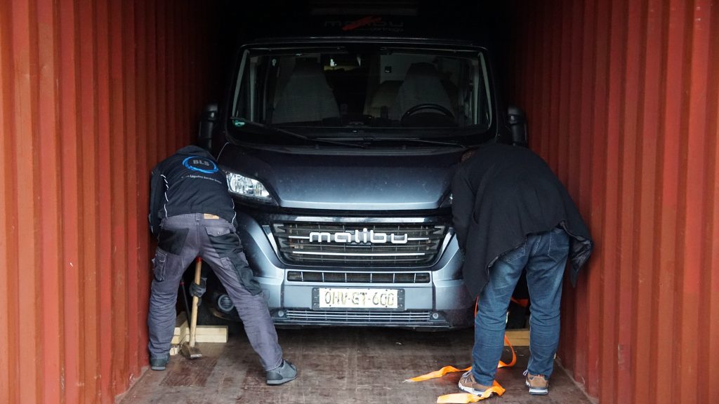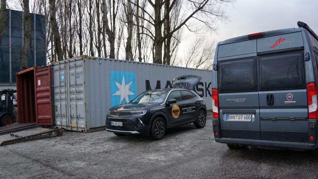 In Hamburg war vor Ort nicht so viel Personal (ein Mann) wie in Montevideo. Also habe ich mich freiwillig geopfert, um in den Camper zu gelangen. Es ging wieder über die Motorhaube und den Spiegel mit festhalten an der Markise und dann zwischen Camper und Containerwand Richtung Schiebetür nach unten rutschen. Das ging schneller und besser, als ich es in meinen Überlegungen erwartet hatte. Noch einmal durch den Camper und durch das Heck hinaus (der Türöffner war nicht so leicht zu finden), um die Spannbänder, mit denen die Räder fixiert waren, zu lösen.