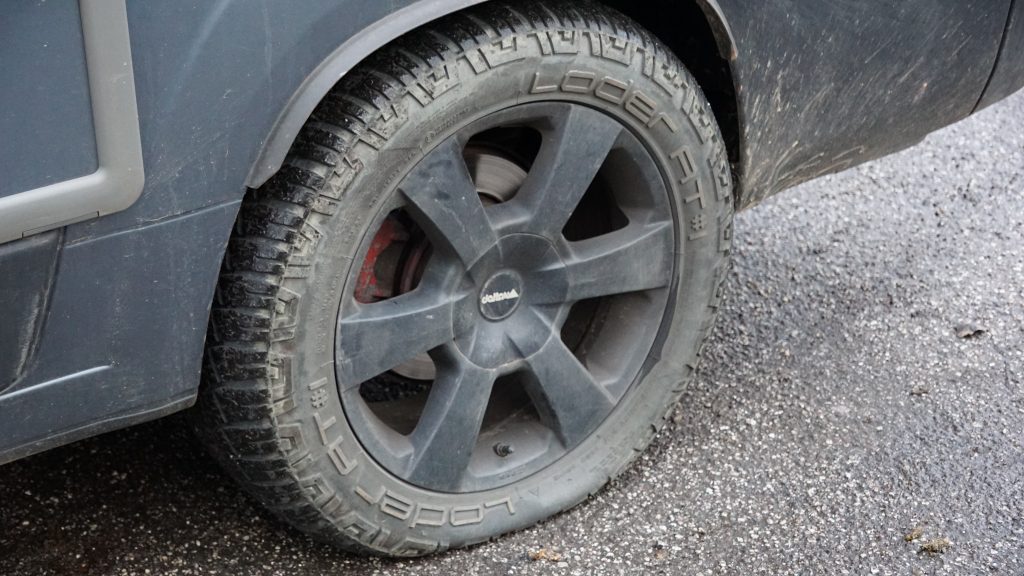 Klar, der hintere Reifen auf der Fahrerseite war platt, damit haben wir gerechnet. Der Kompressor kann ja auch mal wieder ein bisschen arbeiten.